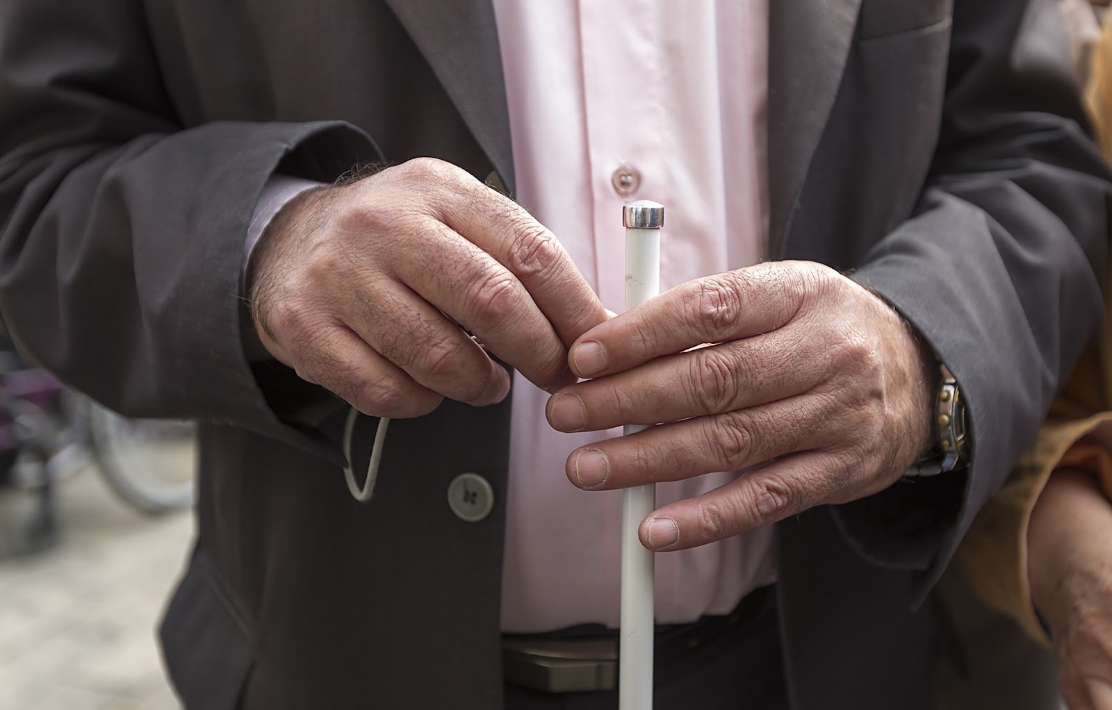 Тифлокомментарий: цветная фотография. Морщинистые мужские руки с темными волосами на пальцах и запястье касаются белой трости, в левой руке мужчина держит белый шнурок, закрепленный на ручке трости. На мужчине розовая рубашка и серый пиджак из плотной ткани. Под левым рукавом виднеются часы.