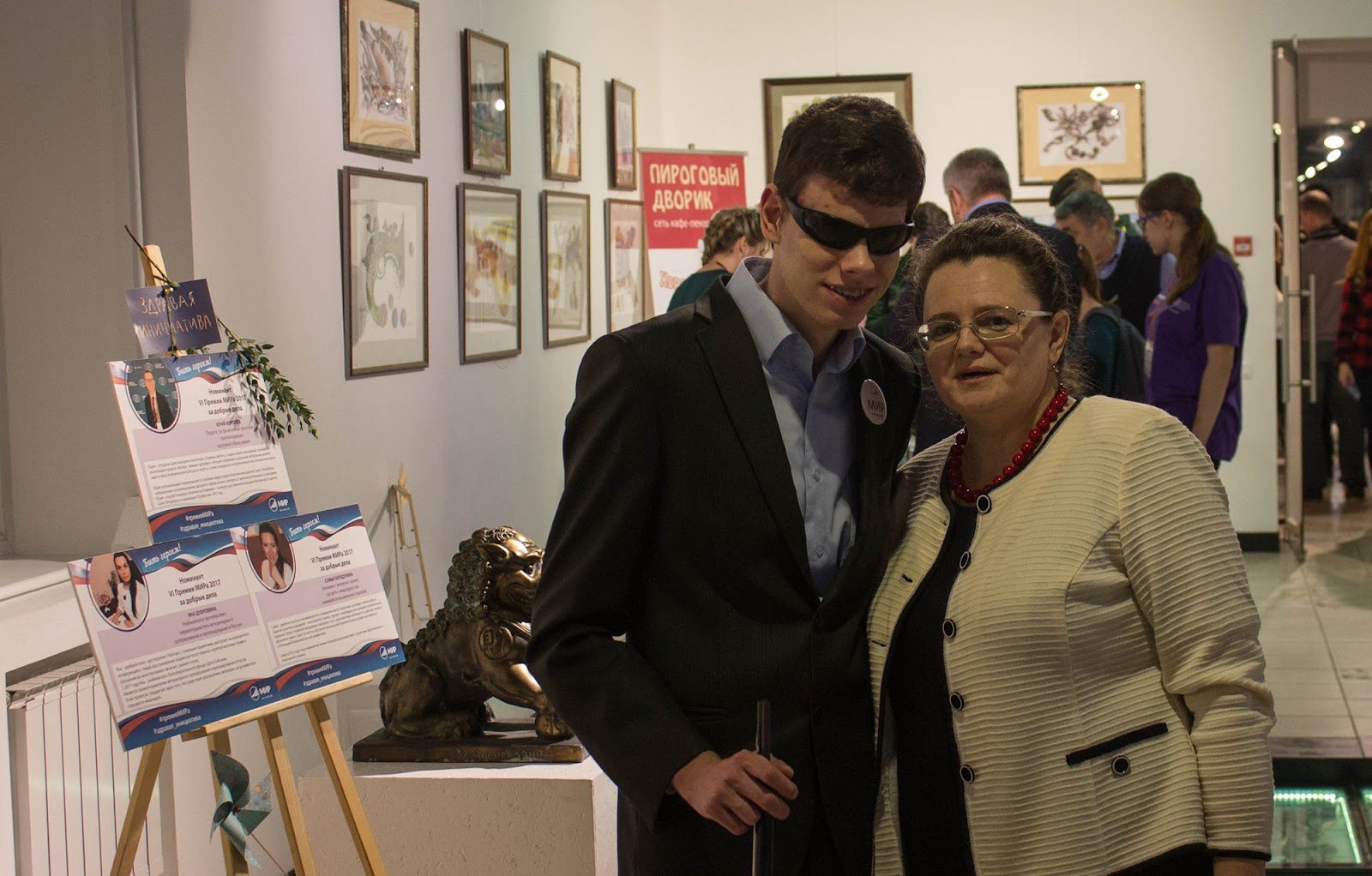Тифлокомментарий: Коля с мамой Юлией стоят в большой комнате. Они прижимаются друг к другу и смотрят в камеру. На Коле черный костюм и голубая рубашка. На лацкане пиджака большой круглый значок. В правой руке Коля держит трость. На маме трикотажный белый деловой пиджак и красные бусы. По стенам развешаны картины, помещении стоят скульптуры и стойки с информационными материалами. Сзади группа людей.