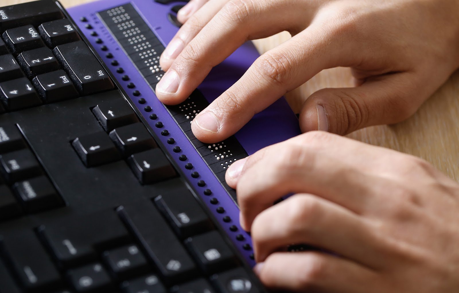 Тифлокомментарий: руки человека дотрагиваются до точек на брайлевском дисплее, который находится ниже обычной клавиатуры.