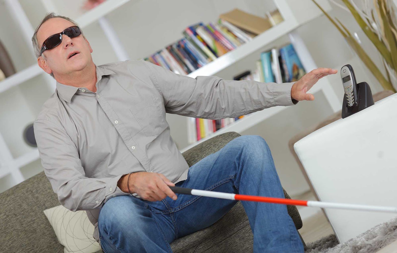 Тифлокомментарий: комната. На сером низком диване рядом с белым невысоким столиком сидит мужчина в темных очках и с белой тростью с красной полосой в правой руке. На столике стоит радиотелефон на базе, мужчина левой рукой тянется к трубке телефона. На мужчине светло-серая рубашка и синие джинсы. За диваном — белый книжный стеллаж, на полу комнаты пушистый серый ковер.