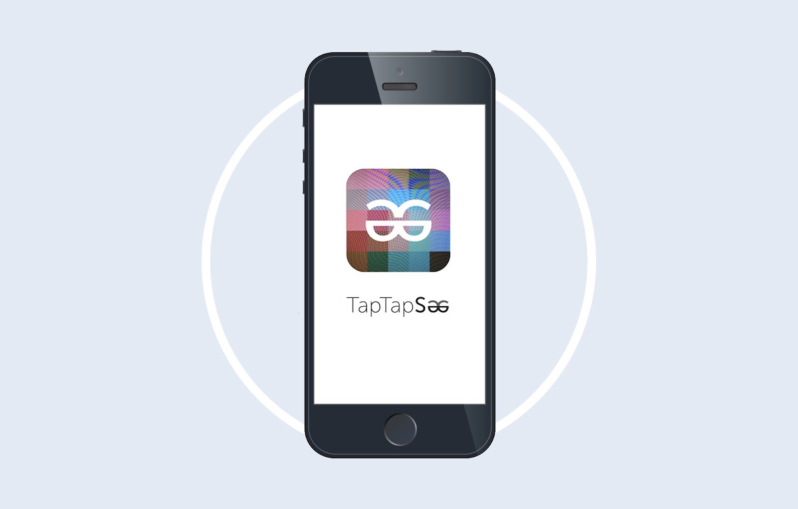 Тифлокомментарий: цветной фотоколлаж. Светло-серый фон с абстрактным узором. В центре — изображение смартфона с черным корпусом. На экране заставка приложения TapTapSee: на белом фоне квадрат со скругленными углами, составленный из 25 маленьких разноцветных квадратов. Внутри квадрата — две перевернутые на 180 градусов буквы «е», соединенные между собой, причем левая буква развернута зеркально. Ниже надпись латиницей черными буквами TapTapSee, все три слова слитно, каждое слово начинается с заглавной буквы, две последние буквы «е» выглядят, как на логотипе.