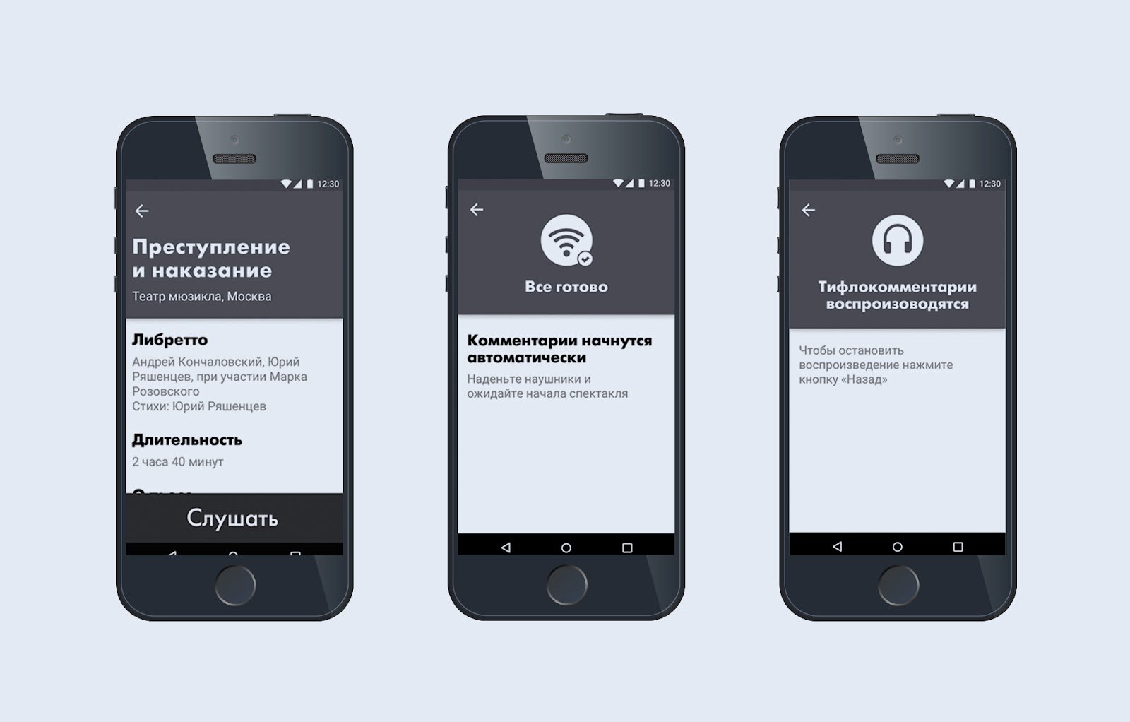 Тифлокомментарий: цветной фотоколлаж. На светло-сером фоне в ряд изображены три смартфона с черным корпусом. На экране каждого устройства — интерфейс приложения «Искусство.Вслух». Интерфейс разделен на темно-серую панель сверху и рабочее окно белого цвета. На экране левого смартфона канал спектакля «Преступление и наказание» Театра мюзикла с информацией об авторах и длительности. Внизу экрана серая кнопка с белой надписью «Слушать». На экране центрального смартфона — страница перехода к прослушиванию. В рабочем окне надпись: «Комментарии начнутся автоматически. Наденьте наушники и ожидайте начала спектакля». На экране правого смартфона — страница воспроизведения тифлокомментария.