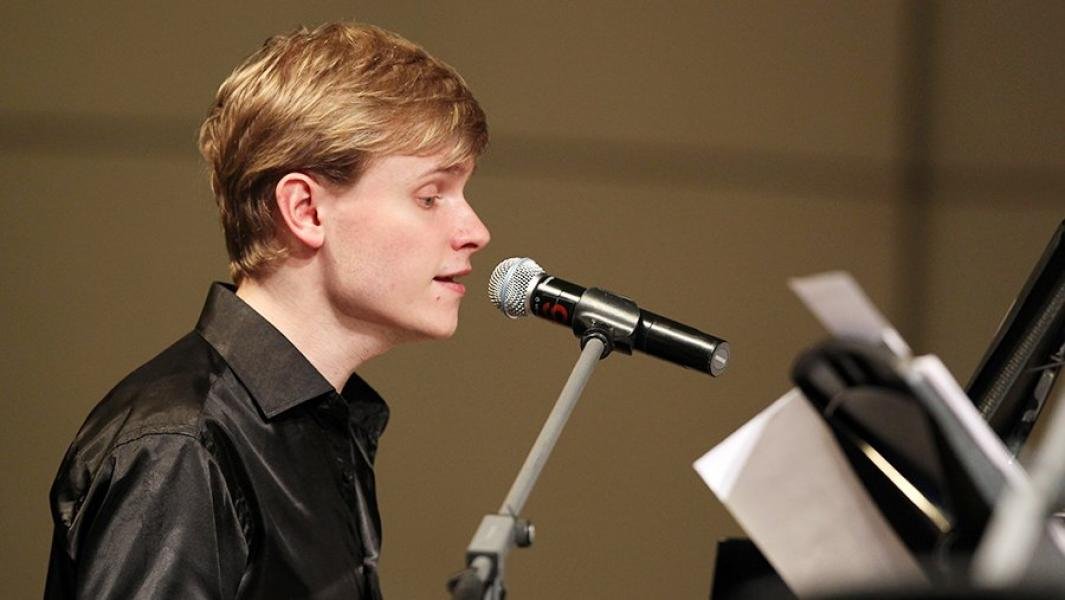 Тифлокомментарий: цветная фотография. Русый молодой человек сидит за роялем, поет в микрофон. Это Олег Аккуратов. У него тонкие черты лица, черная рубашка.