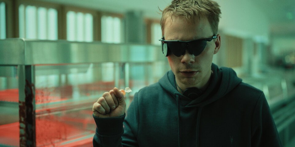 Тифлокомментарий: цветной кадр из сериала «СГ: Слепоглухой/Супергерой». Крупным планом русый парень в темной толстовке. Он стоит у большой стеклянной емкости, сжимает в кулаке леденец. На парне черные очки с линзами треугольной формы. Между линзами видеокамера, на дужке — электропередатчик.