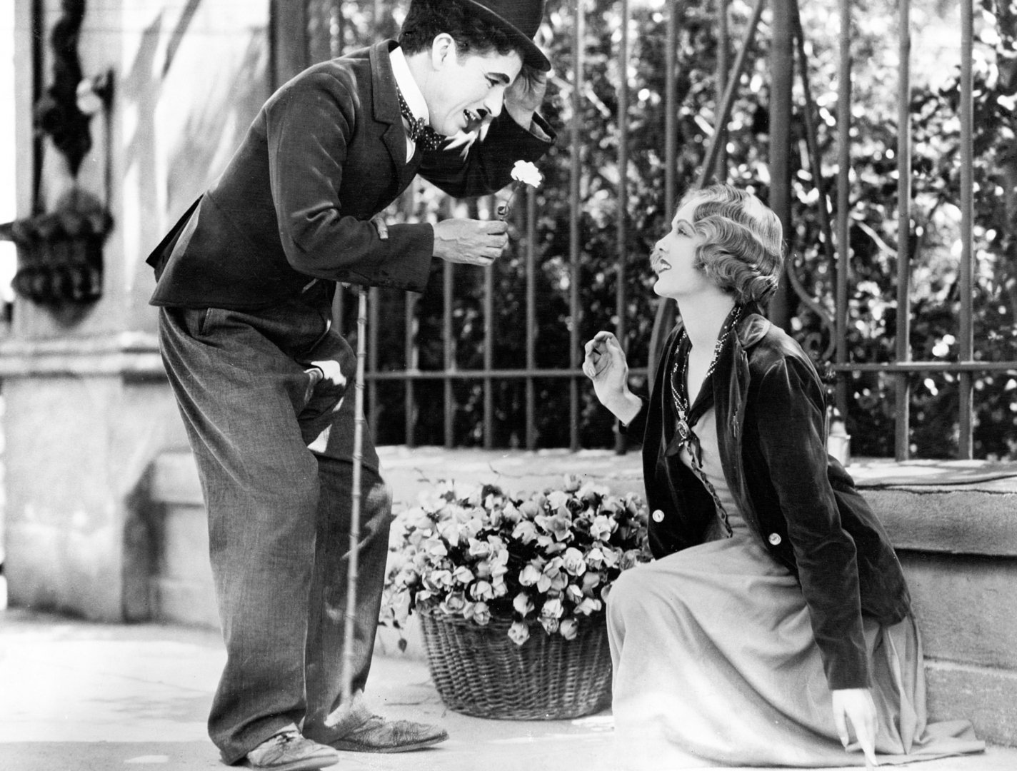 Тифлокомментарий: черно-белый кадр из фильма «Огни большого города». Молодые мужчина и женщина у кованого забора. Девушка сидит рядом с большой цветочной корзиной, с улыбкой смотрит на мужчину. Он смущенно склонился перед ней с цветком в руке. У девушки элегантная прическа, мягкие черты лица, черный пиджак, светлое платье. У мужчины густые темные волосы, правильные черты лица, усы. На нем черные котелок, пиджак и брюки, белая рубашка, галстук-бабочка. На предплечье накинута бамбуковая трость.