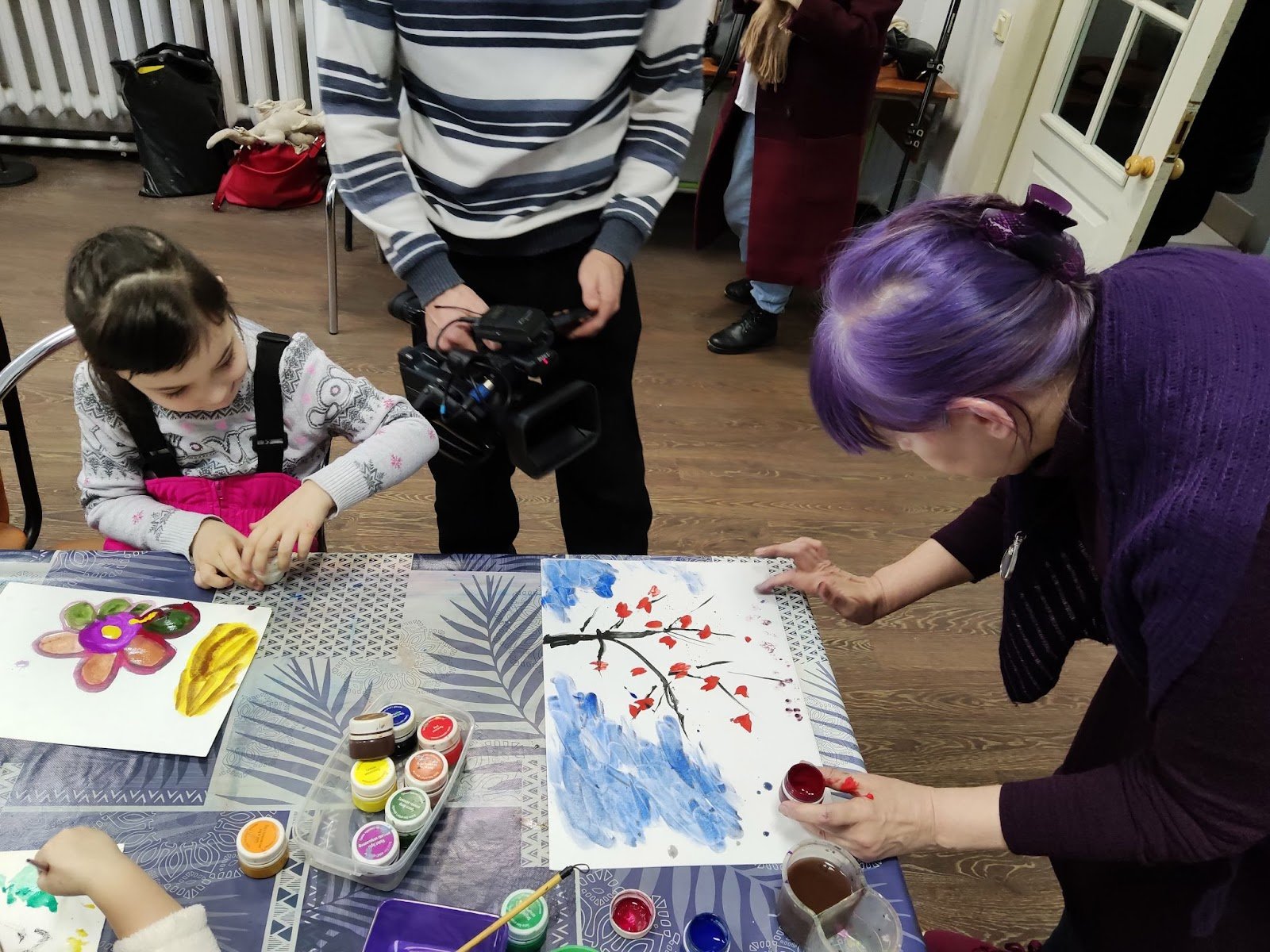 Тифлокомментарий: цветная фотография. В просторном помещении творческой студии идут занятия по рисованию. За столом сидят и рисуют дети. Темноволосая девочка лет пяти открывает баночку с гуашью. Перед ней на столе лежит рисунок крупного цветка. Справа у стола стоит Ирина Поволоцкая в фиолетовом платье. Ее фиолетовые волосы собраны на затылке. Ирина склоняется над столом и чуть касается пальцем листа бумаги. На рисунке — голубое небо и черная ветка с красными бутонами.