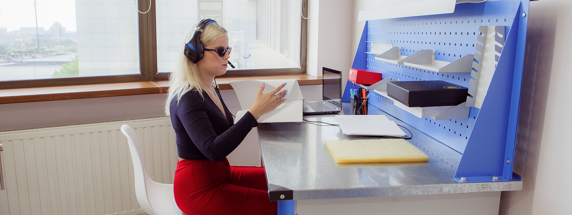 Тифлокомментарий: цветная фотография. Тот же офис. У большого окна сидит молодой человек в белой рубашке с коротким рукавом и красном галстуке с цветочным узором. На его голове гарнитура: массивные наушники с микрофоном, на глазах очки в тонкой оправе. Мужчина держит перед собой тетрадь на пружине. Перед ним на столе стоит открытый ноутбук, принтер, ручки и карандаши в подставках.
