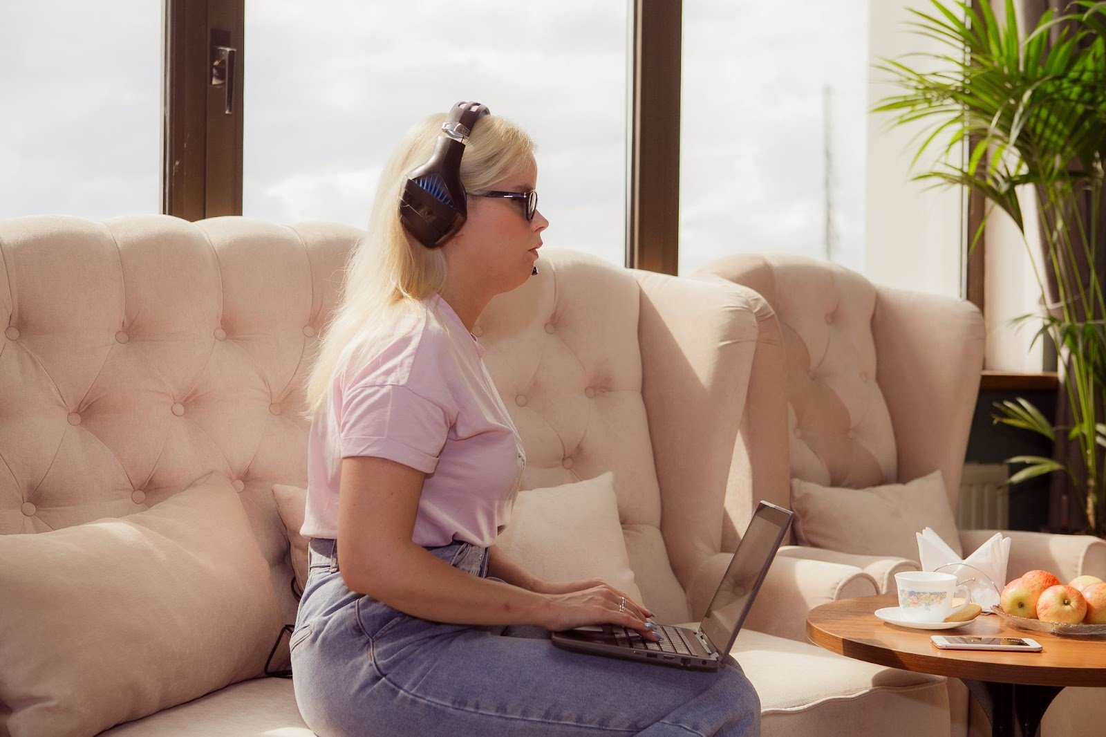 Тифлокомментарий: цветная фотография. Человек работает за ноутбуком, который стоит на светлом столе. Пальцы набирают текст на темной клавиатуре. Рядом стоит белая керамическая кружка.