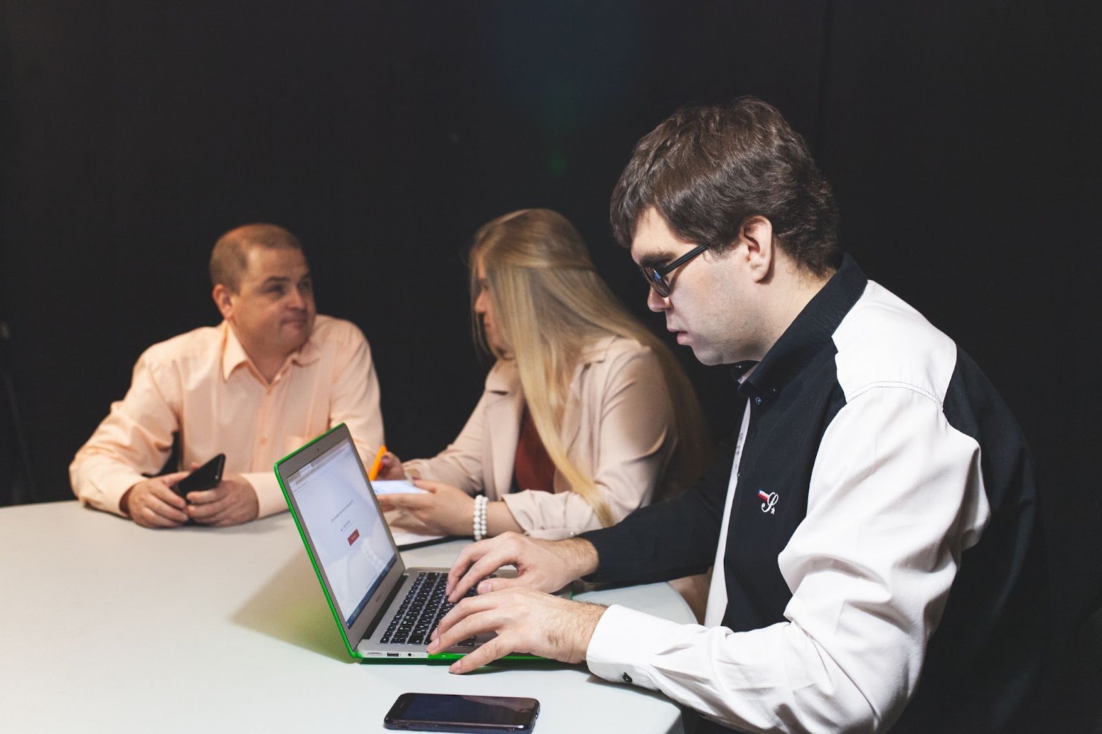 Тифлокомментарий: цветная фотография. На черном фоне за белым круглым столом сидят три человека: двое мужчин, между ними девушка с длинными светлыми волосами и в розовом жакете. Она разговаривает с мужчиной в розовой рубашке с телефоном в руках. Слева от нее сосредоточенно работает за ноутбуком молодой темноволосый человек. Он одет в черно-белую рубашку, на его глазах темные очки.