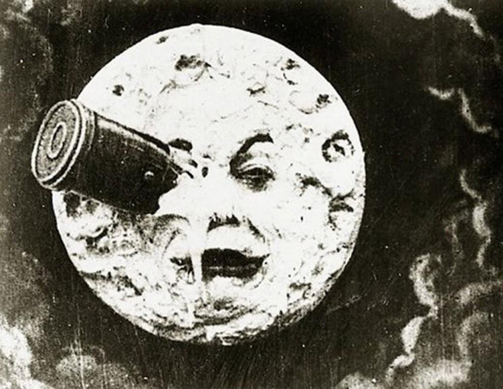 Тифлокомментарий: кадр из немого фильма «Путешествие на Луну». В темном облачном небе — полная светлая Луна с человеческим лицом, изрытая кратерами. У Луны яркие полные губы, широкие брови. Из ее правого глаза торчит массивный снаряд.