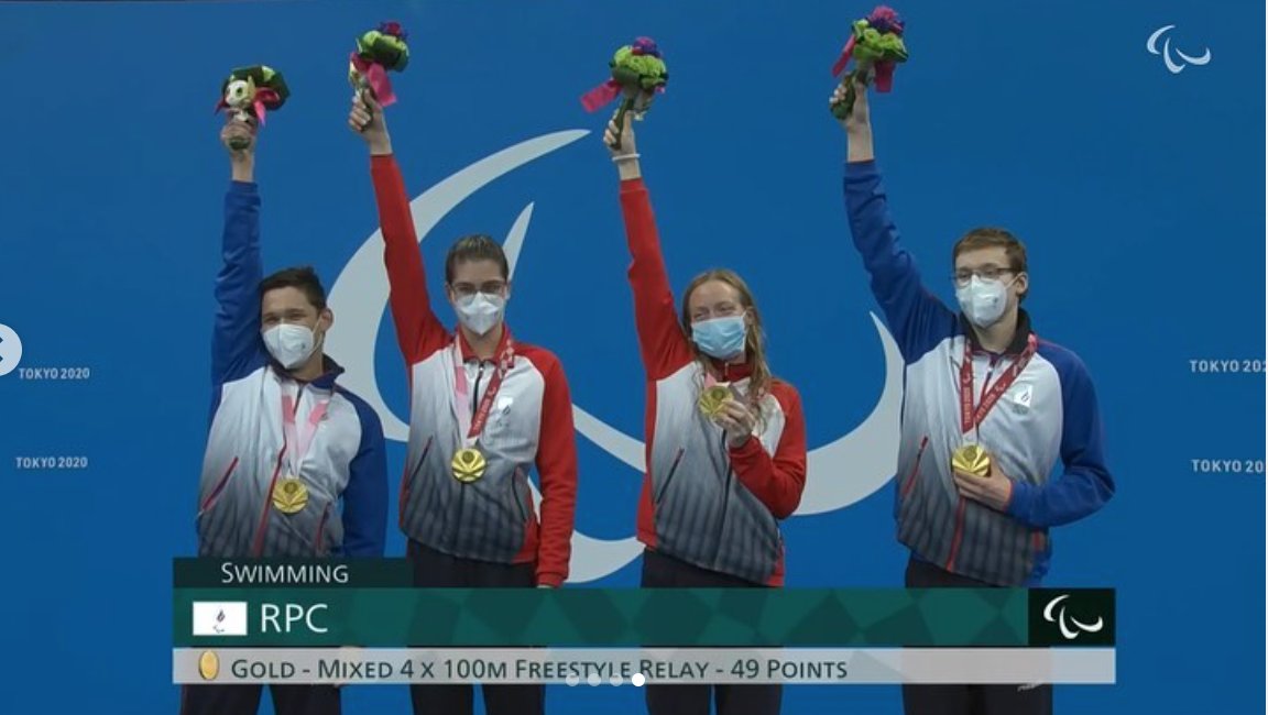 Тифлокомментарий: цветная фотография. Две девушки и двое юношей в бело-сине-красной спортивной форме и медицинских масках стоят на пьедестале почета. На их груди золотые медали. Каждый из спортсменов поднял правую в руку и держит в ней букет. Внизу флаг Паралимпийского комитета России и надпись на английском языке: «Золото в комбинированной эстафете по плаванию 4×100 метров».