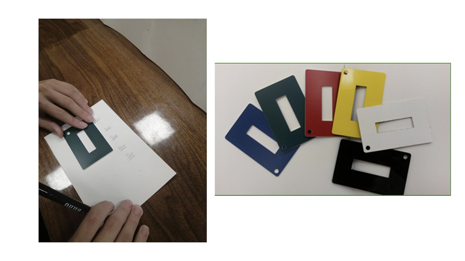 Тифлокомментарий: коллаж из двух цветных фотографий. Первое фото: На коричневом столе лежит белый лист бумаги. С помощью темной ограничительной рамки с окошечком внутри человек тренируется ставить подпись. Выше видны несколько прописных букв «м». Второе фото: на белом фоне веером выложены шесть ограничительных рамок разных цветов.