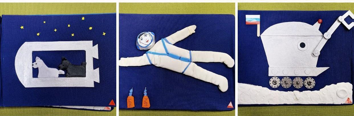 Тифлокомментарий: коллаж из трех цветных фотографий. На них изображены страницы рукодельной книги-игрушки на тему космоса. Это контрастные объемные иллюстрации на синем фоне: две собаки, летящие в ракете среди звезд, космонавт, парящий в невесомости, белый луноход с российским флагом.