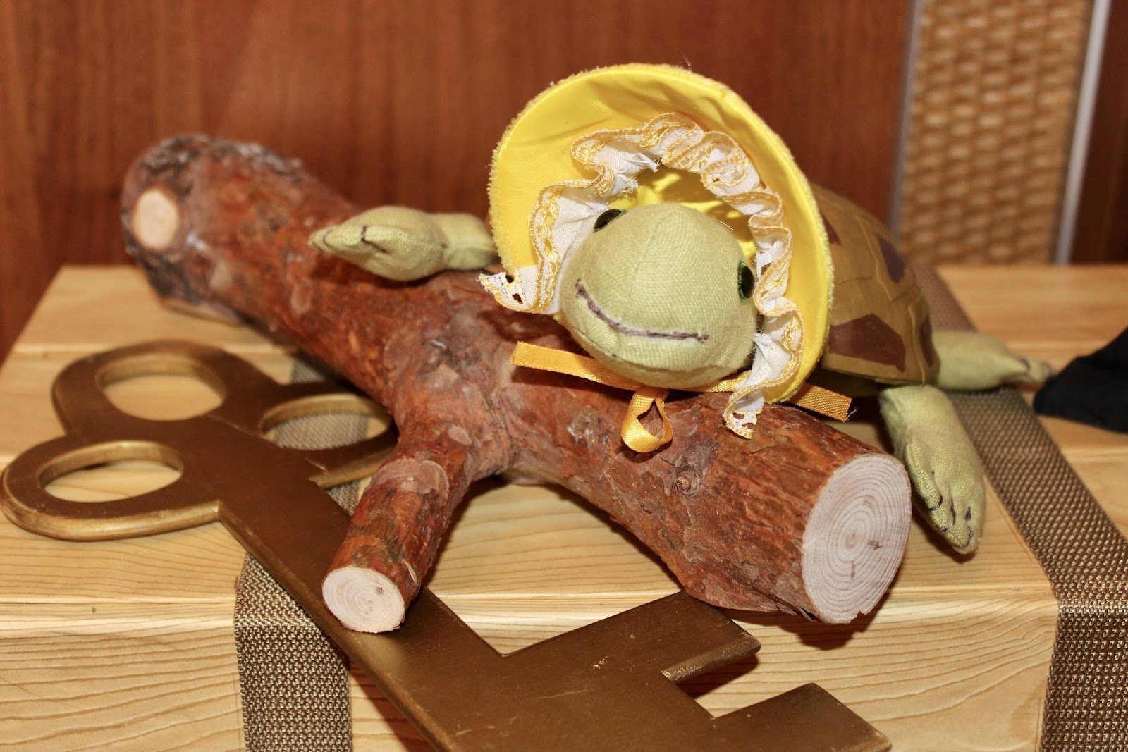 Тифлокомментарий: цветная фотография. На деревянной поверхности, перехваченной поперек двумя широкими коричневыми стропами, лежат игрушки и реквизит для кукольного театра. Это большой резной ключ с фигурной круглой головкой и спил коряги, на котором расположилась черепаха в желтом кружевном чепце. Игрушка сшита из ткани и кожи.