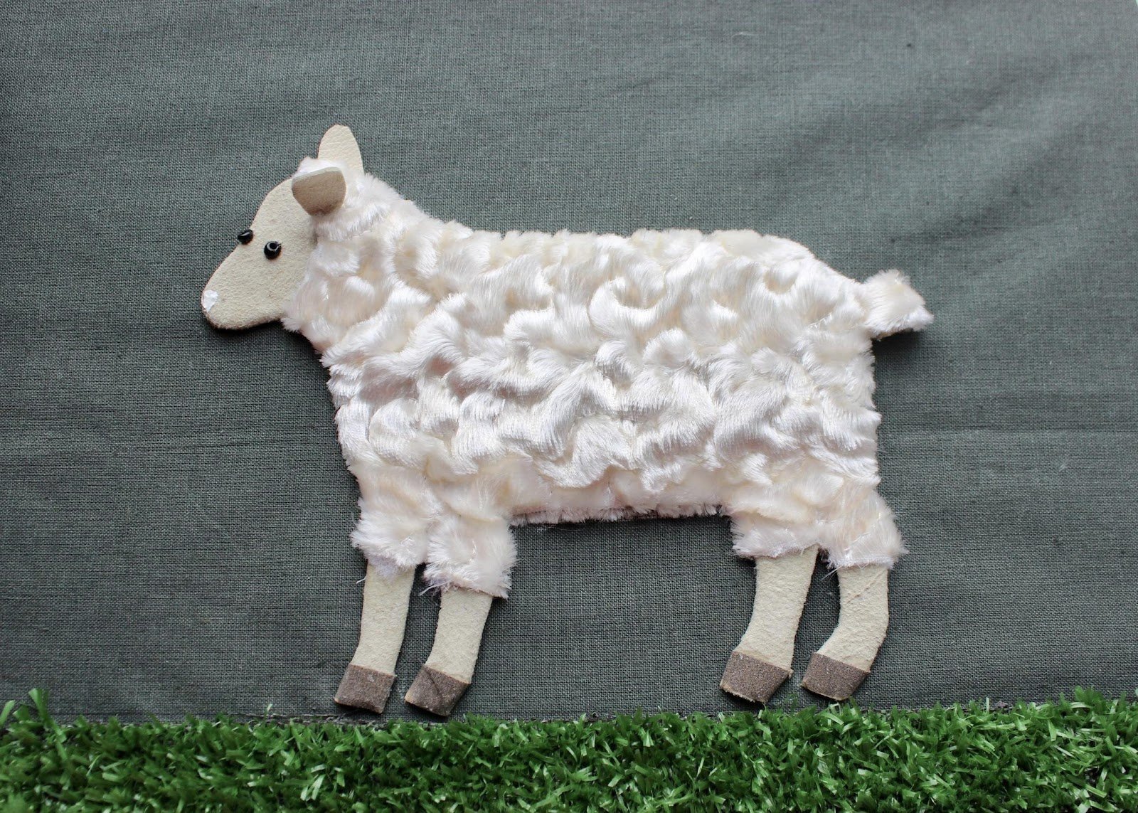 Тифлокомментарий: цветная фотография. Тактильная иллюстрация из ткани. На сером фоне объемное изображение белого барашка, стоящего на зеленой пушистой траве. У барашка небольшие ушки и хвост, глазки из черных бусин, тело из волнистого меха, серые копытца.