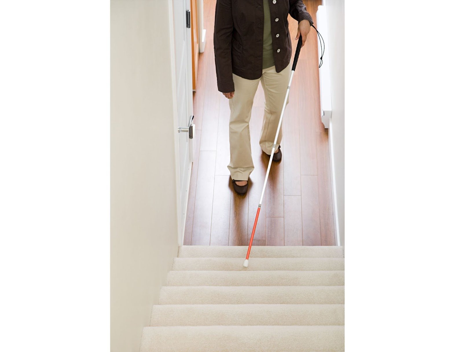 Тифлокомментарий: цветная фотография. Коридор жилого дома. Женщина в светлых штанах и коричневой рубашке, ориентируясь с помощью трости, подходит к лестнице.