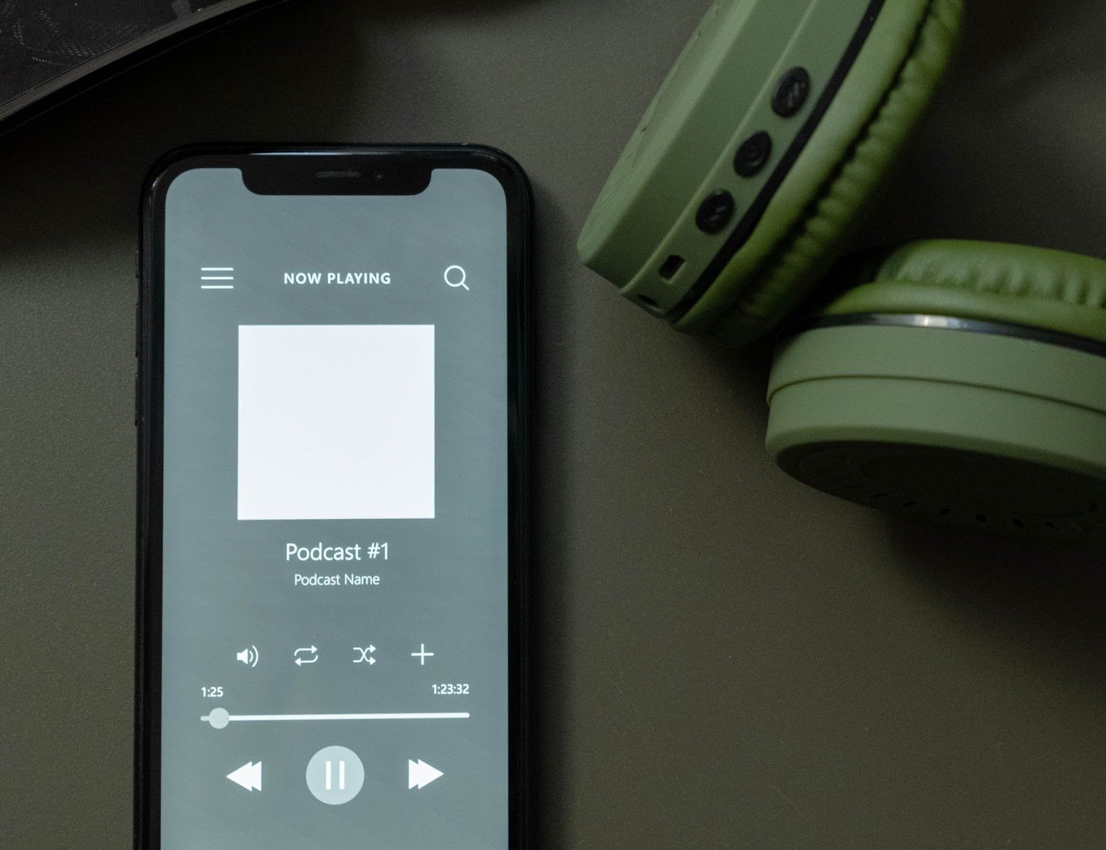 Тифлокомментарий: цветная фотография. На серой поверхности лежат наушники с мягкими зелеными чашками и смартфон. На его экране — программа воспроизведения звукового файла. На сером фоне белый квадрат и надписи на английском языке «Сейчас воспроизводится» и «Подкаст № 1». В нижней трети экрана панель управления: кнопки паузы, перемотки и уровня громкости.