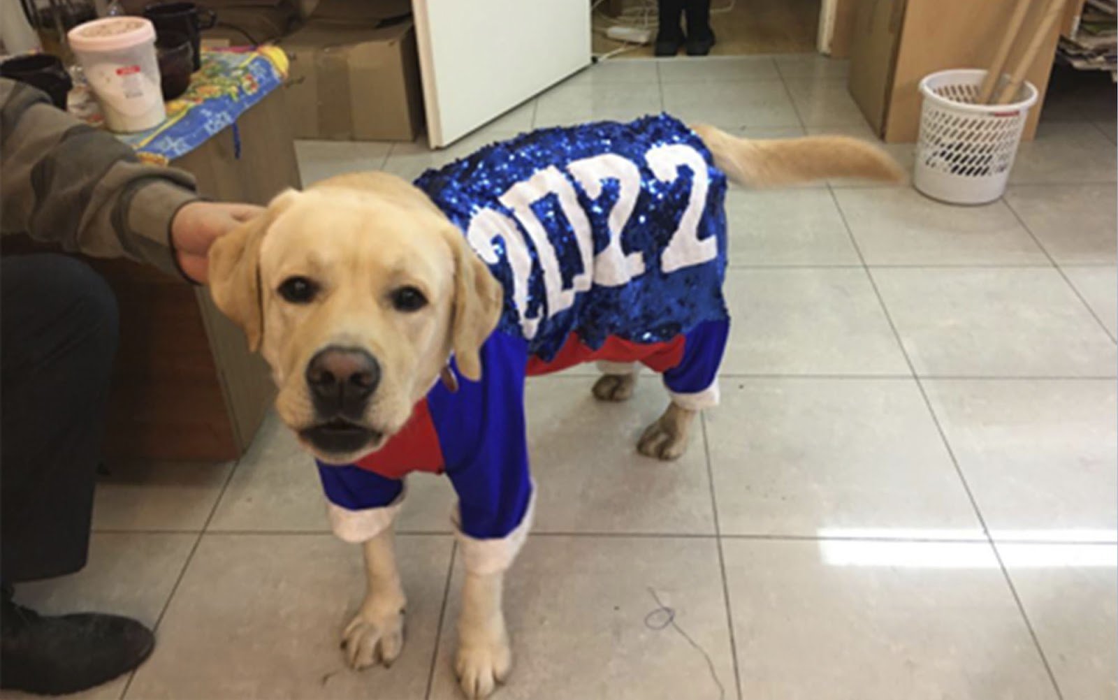 Тифлокомментарий: цветная фотография. Небольшое светлое помещение с кафельным полом. В центре стоит палевый лабрадор в синем блестящем комбинезоне с пайетками. Это пес-проводник Алексея Гришаева Денни. На комбинезоне пса крупная белая надпись— 2022. Мужчина, сидящий рядом, чешет его за ухом.