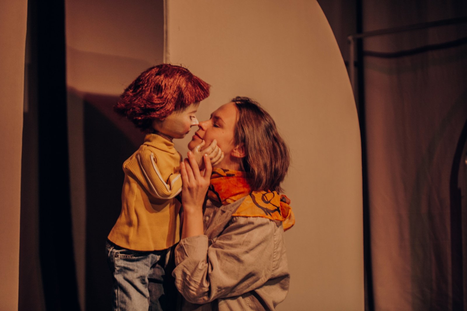 Тифлокомментарий: цветная фотография. Фрагмент спектакля «Музыка моего дятла». На светлом фоне лицом друг к другу стоят актриса и кукольная девочка- подросток. Их глаза закрыты, они чуть соприкасаются носами. Актриса стоит на коленях, запрокинув голову, слегка улыбается. Она чуть придерживает куклу за руку, та прикасается к ее щеке. На актрисе светлая одежда с ярким оранжевым шейным платком, рыжая пышноволосая кукла одета в джинсы и желтый пуловер.