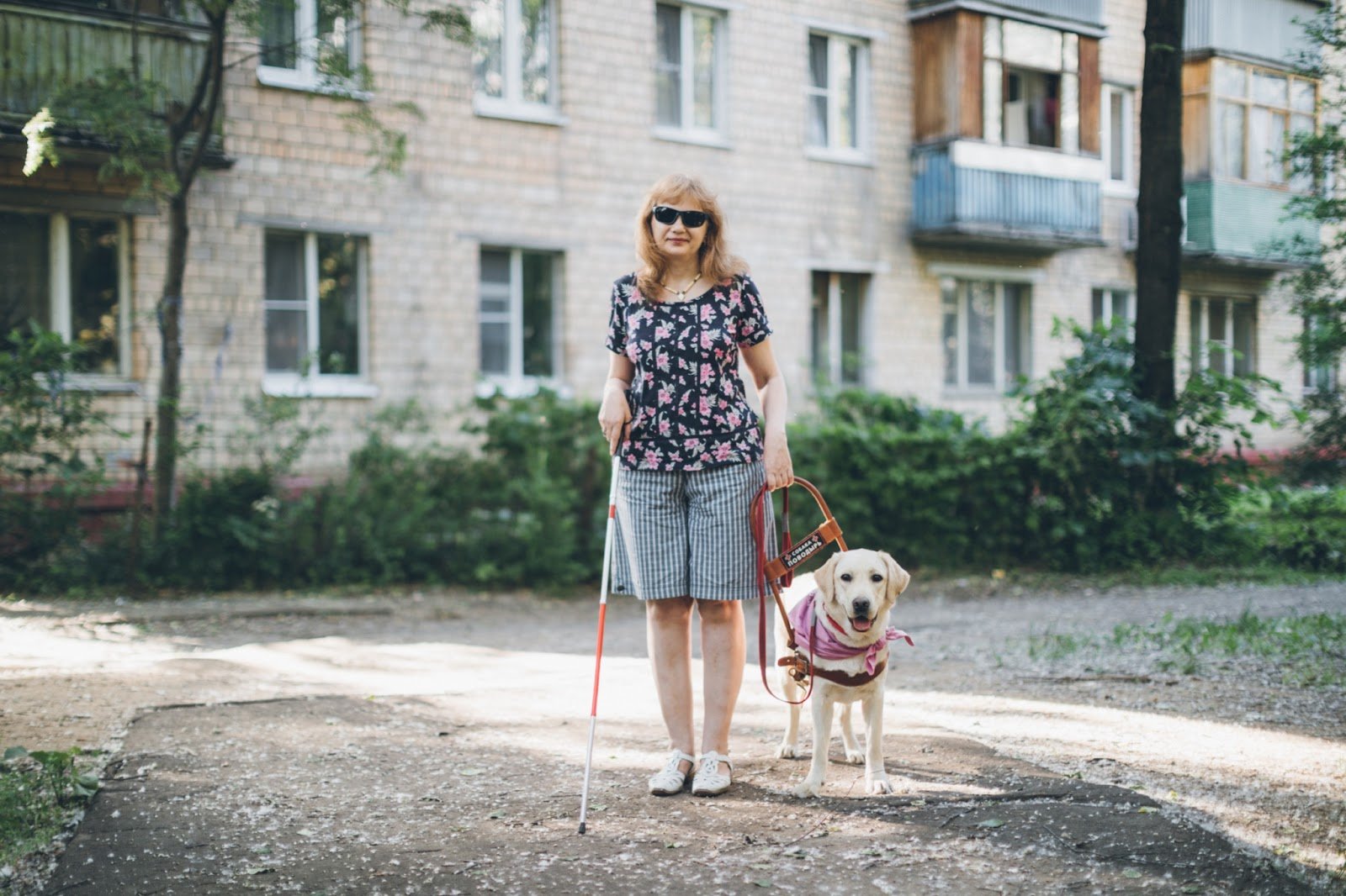 Тифлокомментарий: цветная фотография. Солнечный летний день. Хозяйка и ее лабрадор стоят на тротуаре, усыпанным тополиным пухом. В правой руке женщины — белая трость, левой рукой она держит за шлейку собаку-проводника. У женщины светлые волосы до плеч, мягкие черты лица, легкая улыбка. На ней темная блузка с короткими рукавами и цветочным принтом, серые свободные шорты до колен, белые босоножки. Позади них кустарники и серый кирпичный жилой дом.