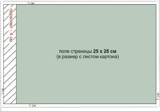 Тифлокомментарий: цветной рисунок. Макет страницы тактильной книги. В центре серого прямоугольника надпись в две строки: «Поле страницы 25 на 28 см. В размер с листом картона». По внешнему периметру прямоугольника проходит пунктирная линия с надписью на каждой из сторон: «1 сантиметр». Левый край прямоугольника представляет собой белую вертикальную полосу с косой штриховкой и надписью: «Переплет 4 сантиметра».