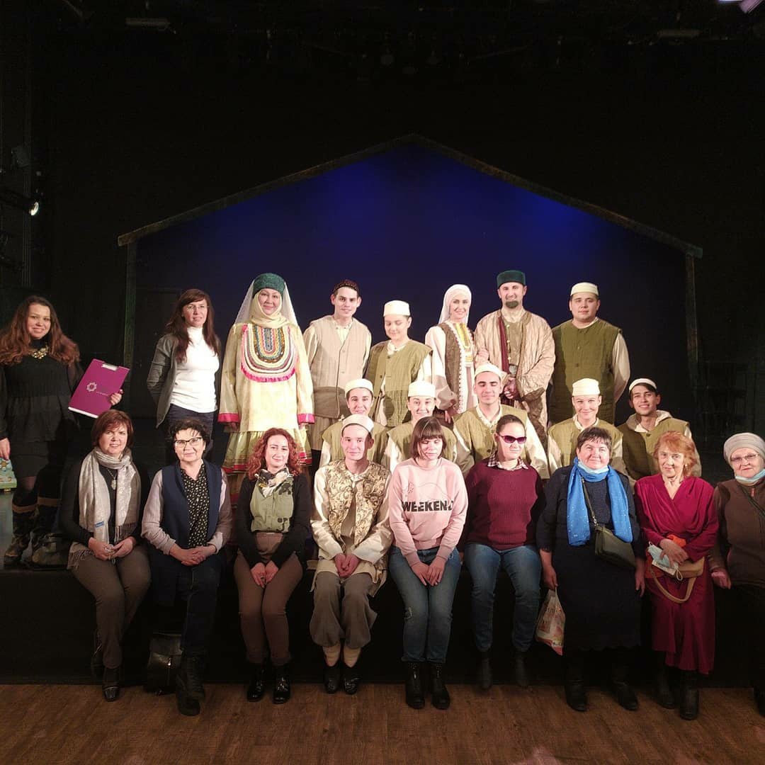 Тифлокомментарий: групповая цветная фотография. На сцене на фоне декораций в три ряда расположились актеры и зрители театра. Все улыбаются. Актеры одеты в стилизованные татарские костюмы в бежевых тонах, национальные головные уборы. Рядом с ними стоит Гелюся в черном нарядном костюме. В первом ряду сидят женщины в повседневной одежде. Некоторые из них в очках, глаза других закрыты.