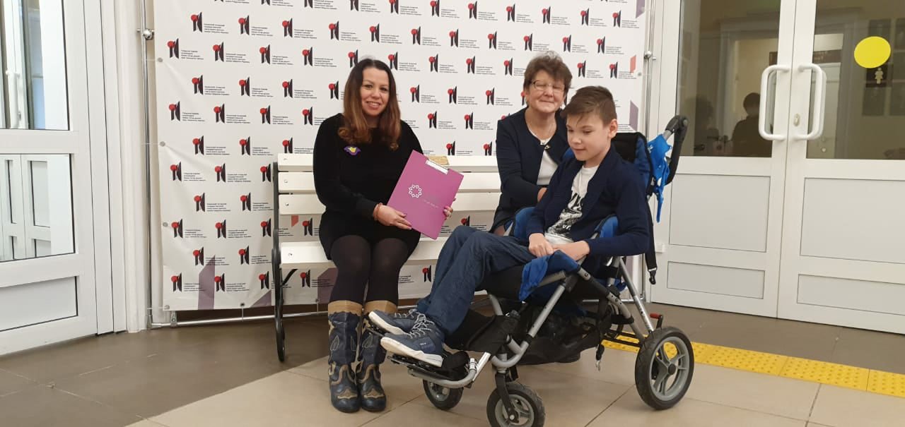 Тифлокомментарий: цветная фотография. В большом светлом фойе на фоне баннера сидит подросток в кресле-коляске. Его глаза закрыты. За ним на белой скамье расположилась женщина средних лет в очках и с короткой стрижкой и Гелюся в черном облегающем платье. В руках она держит папку с символикой портала «Особый взгляд». На полу видна желтая тактильная разметка, в центре стеклянной двери — желтый круг.