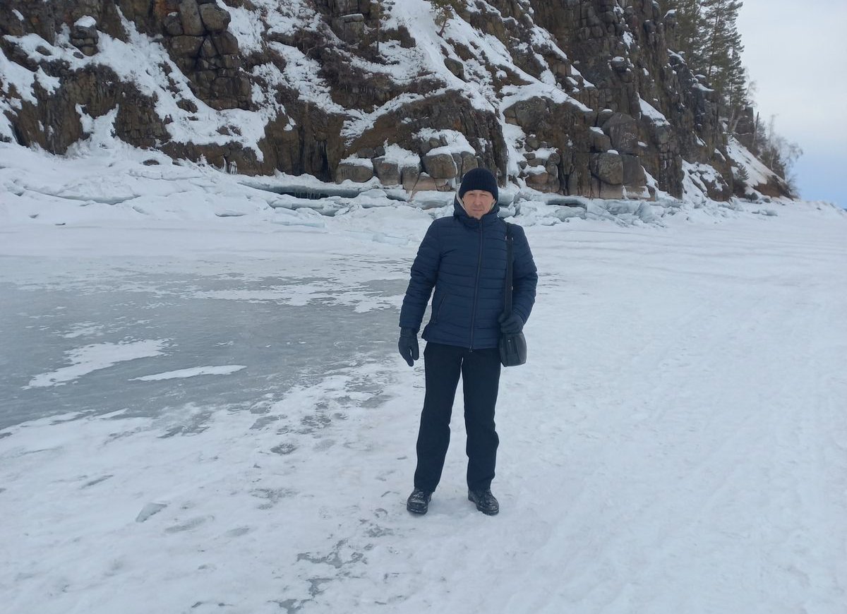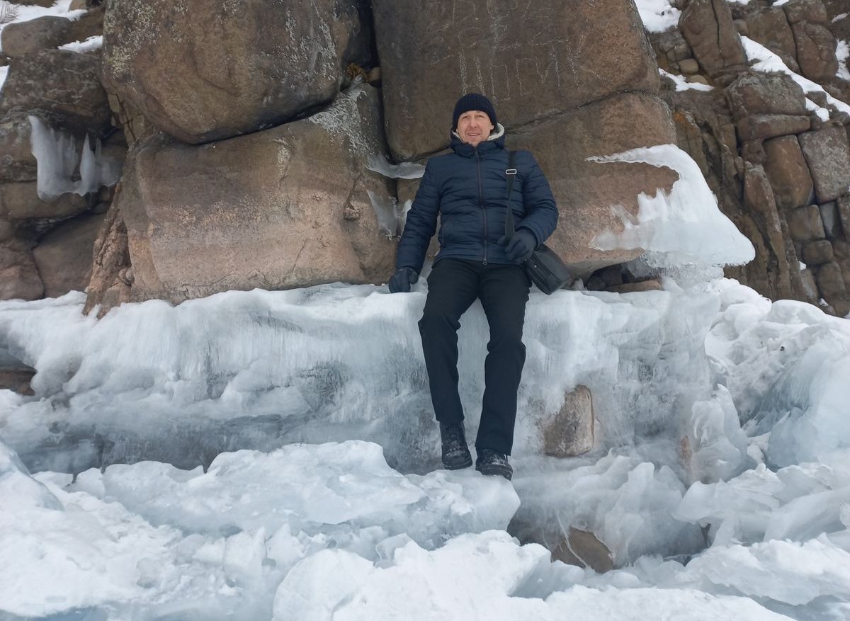 Тифлокомментарий: цветная фотография. Зимний пейзаж. Константин Курмаев стоит на ледяной поверхности водоема на фоне горной гряды. Снег укрывает землю, уступы гор и редкие деревья на склонах.