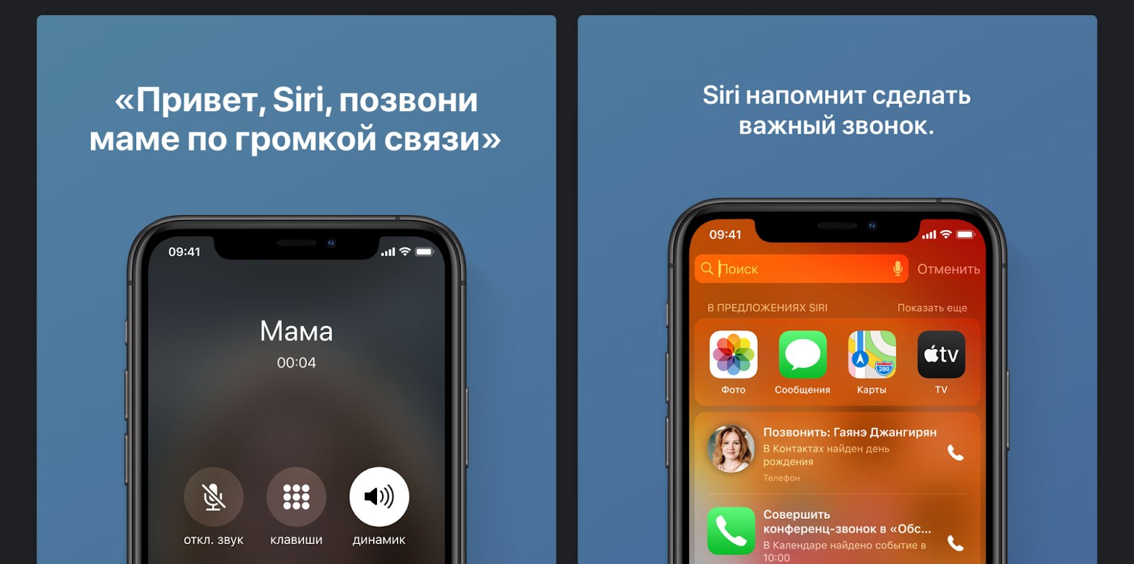 Тифлокомментарий: цветной коллаж. Два черных смартфона на синем фоне. Над смартфоном слева белая надпись: «Привет, Siri, позвони маме по громкой связи». На черном экране телефона надпись «Мама» и длительность разговора. Над смартфоном справа белая надпись: «Siri напомнит сделать важный звонок». На оранжевом экране два напоминания: «Позвонить Гаянэ Джангирян» и «Совершить конференц-звонок».