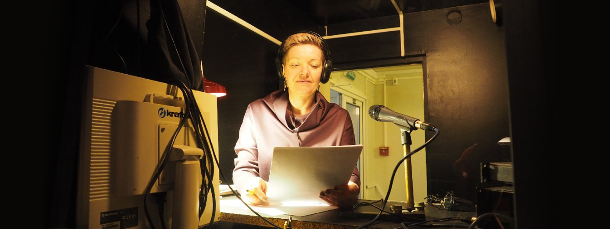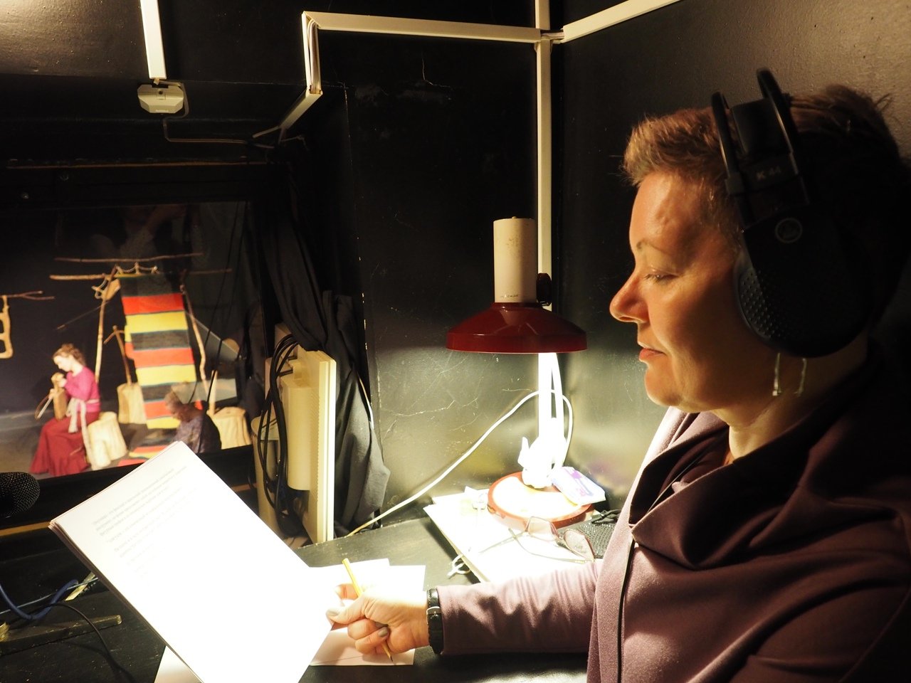 Тифлокомментарий: цветная фотография. Процесс тифлокомментирования спектакля. Александра сидит в профиль в том же помещении. Справа от нее в углу стоит настольная лампа. Женщина держит перед собой страницу с текстом, сверяет его с действием спектакля, который разворачивается перед ней за стеклом. На сцене на фоне декораций — длинных коряг и пестрого полосатого ковра — сидит девушка с косой в длинной бордовой юбке и розовой блузке, играет на смычковом инструменте.