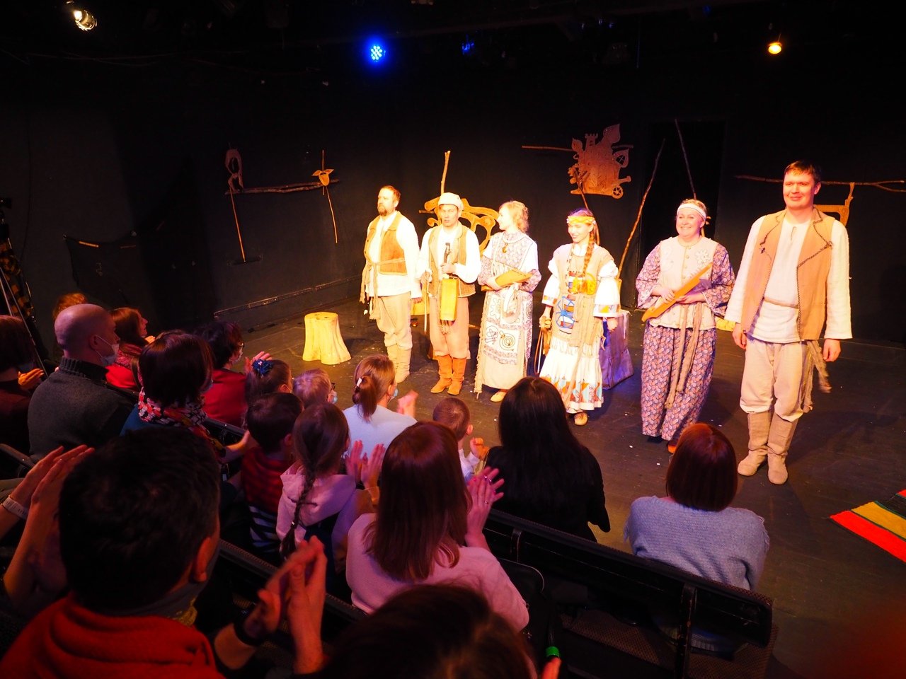 Тифлокомментарий: цветная фотография. Небольшой зрительный зал. Зрители аплодируют актерам спектакля «Сын Медведь». Это трое мужчин и три женщины в этнических костюмах. Они стоят в ряд перед зрителями, улыбаются, держат в руках народные музыкальные инструменты из дерева. Женщины, с налобными повязками, одеты в длинные платья и сарафаны с фартуками. На мужчинах длинные широкие рубахи, подпоясанные тканым поясом, распашные жилеты, порты, кожаные сапоги без каблука.
