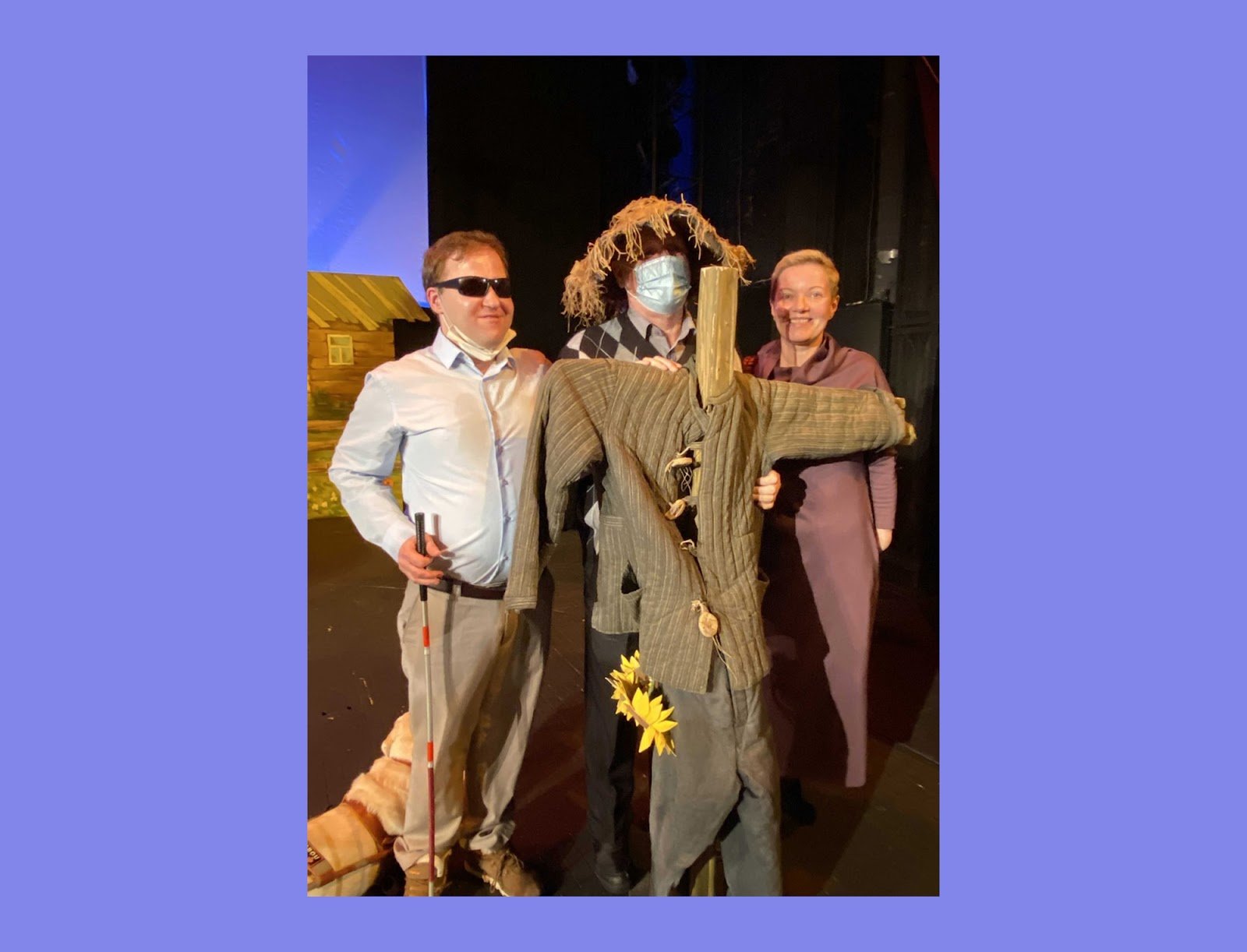 Тифлокомментарий: цветная фотография. На сцене стоит Александра Лавренова в сиреневом платье и два зрителя. Все улыбаются. Один из мужчин, в белой рубашке и классических светлых брюках, держит в правой руке белую трость, на его глазах черные очки. На втором мужчине — медицинская маска и широкая соломенная шляпа. Двумя руками он держит перед собой фигуру пугала: старый ватник и штаны, надетые на деревянный шест с подсолнухами.
