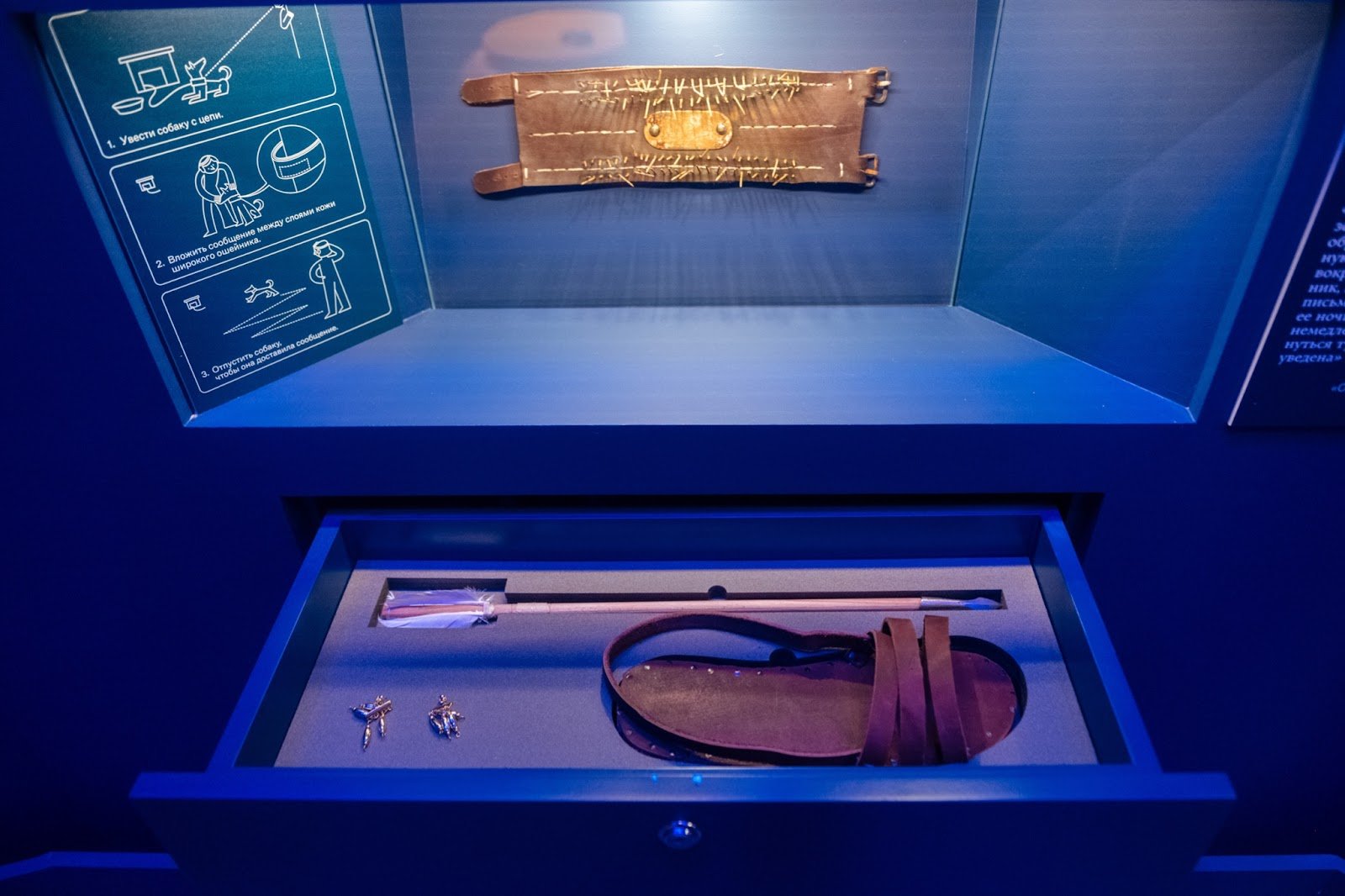 Тифлокомментарий: цветная фотография. Экспонаты музея криптографии с полутемном синем зале с точечной подсветкой. В нише стены закреплен широкий кожаный ошейник с металлическими пряжками. Рядом — картинки с описанием способа передачи сообщения с помощью собаки. Записку вкладывали между слоями кожи ошейника. Внизу, в выдвижном ящике, лежит одна древняя кожаная сандалия и длинное деревянное перо с металлическим наконечником и опушкой.