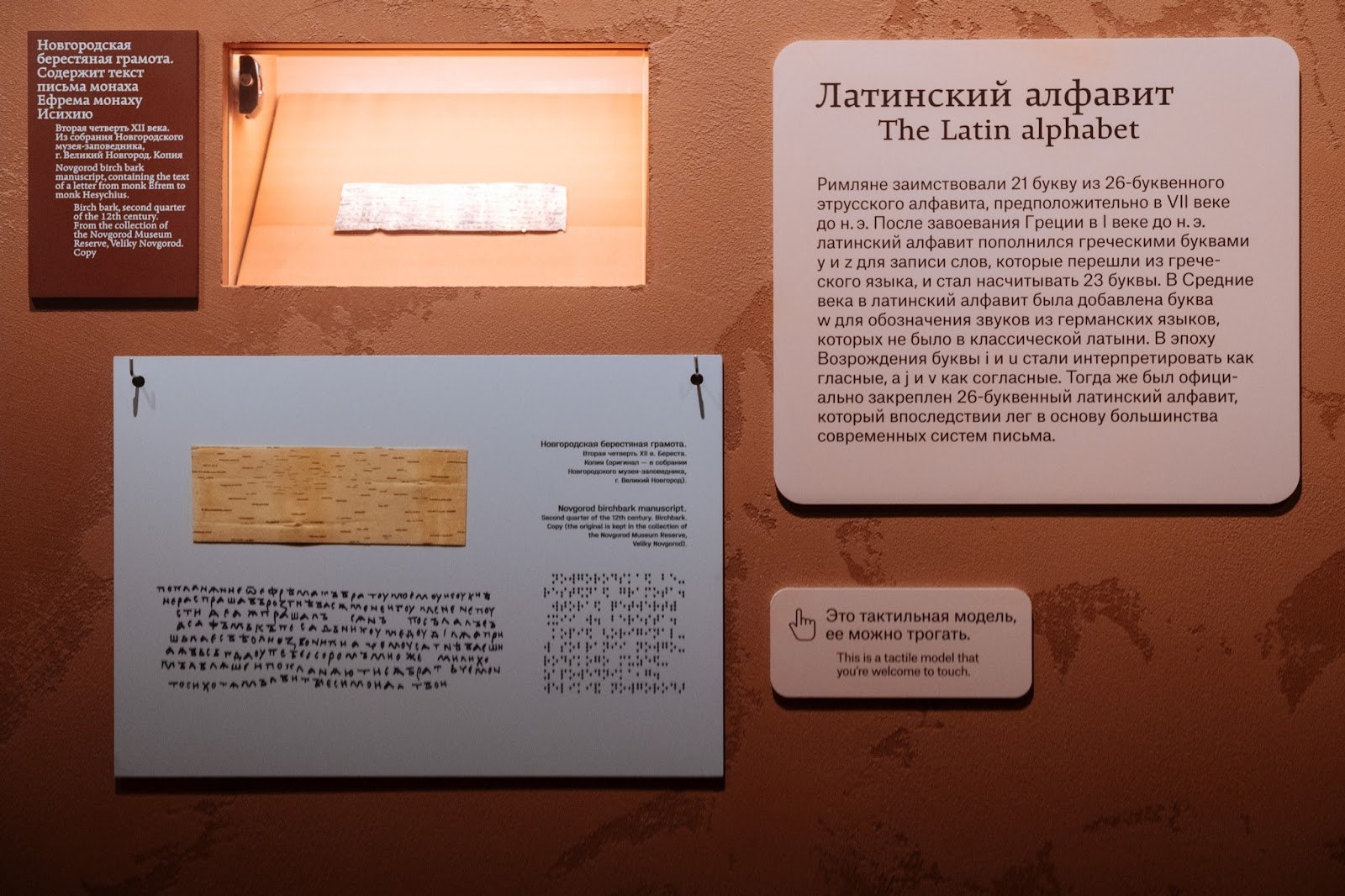 Тифлокомментарий: цветная фотография. На красной стене расположены три прямоугольные таблички разного размера с описанием истории возникновения латинского алфавита и берестяной грамоты. Кусочки бересты сопровождаются надписью «Это тактильная модель. Ее можно трогать». Информация продублирована шрифтом Брайля.