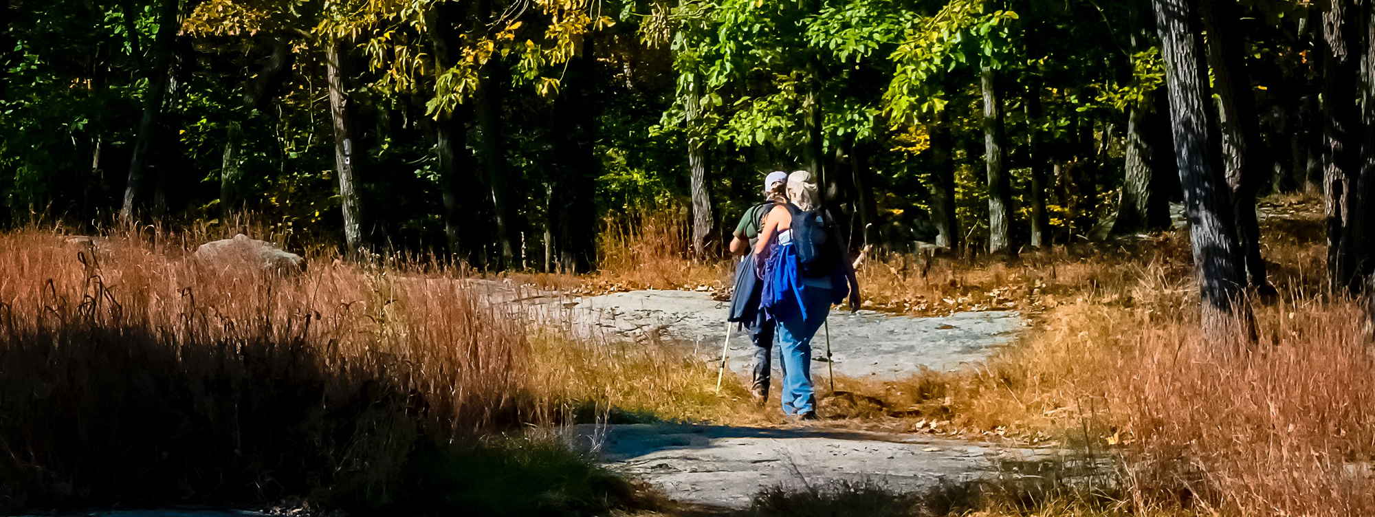 Тифлокомментарий: цветная фотография. По лесной тенистой тропе от нас идут мужчина и женщина. Они одеты в повседневную демисезонную одежду. У женщины в руках палки для скандинавской ходьбы. Справа вдоль дороги стоят высокие лиственные деревья, слева растут кусты, на дорожку ложатся солнечные блики.