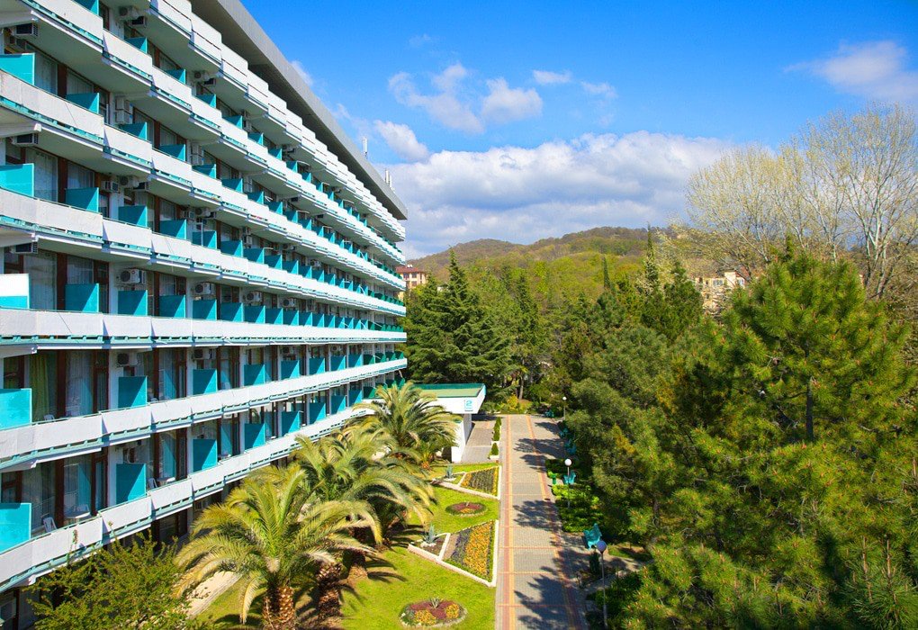 Тифлокомментарий: цветная фотография. Солнечный летний день. У подножия лесистых гор стоит восьмиэтажный санаторий с ленточными бело-голубыми балконами. Вдоль санатория тянутся ухоженные газоны с цветниками и пальмами и прогулочные дорожки с голубыми лавочками.