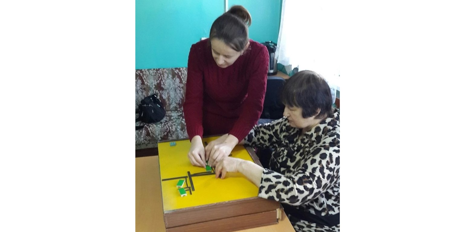 Тифлокомментарий: цветная фотография. Небольшое офисное помещение с мягкой мебелью. За столом сидит брюнетка средних лет с закрытыми глазами, в платье с леопардовым принтом. Рядом с ней стоит женщина в бордовом джемпере. Перед ними на столе большая деревянная коробка с желтой поверхностью, имитирующая квартиру. Женщины в четыре руки расставляют в условных комнатах импровизированную мебель— блоки зеленого цвета.