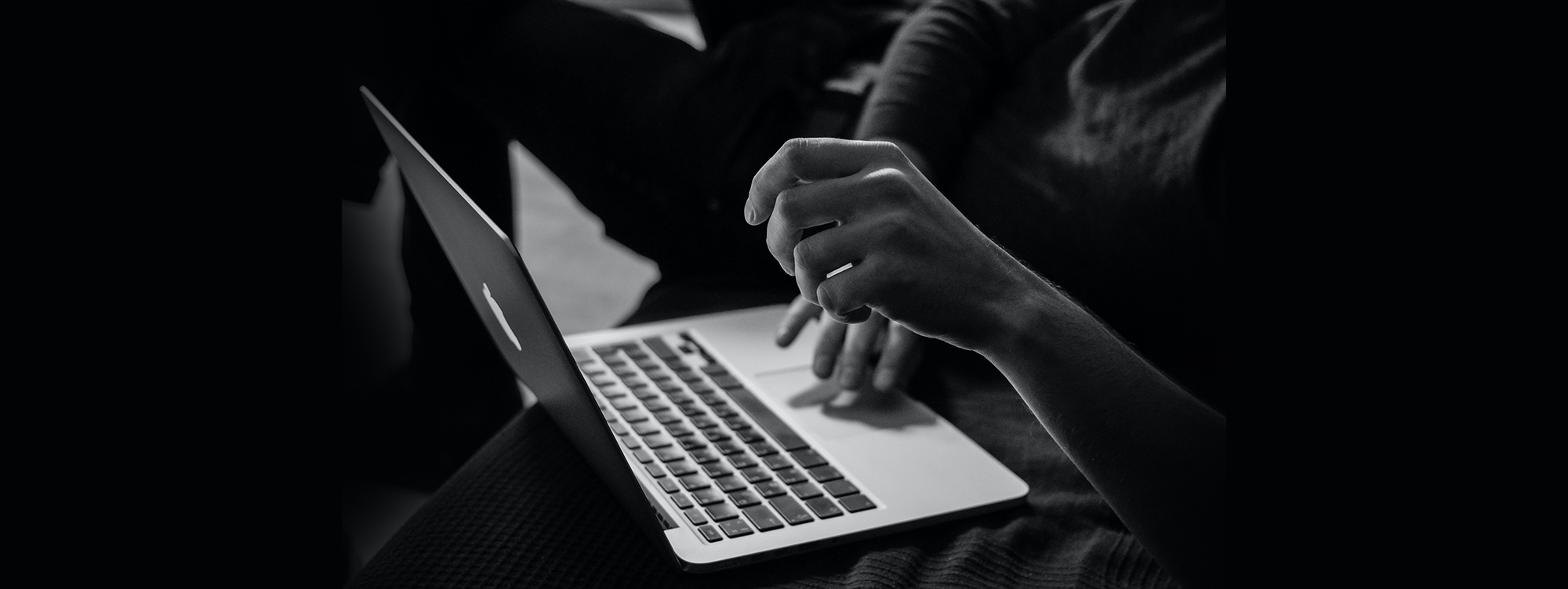 Тифлокомментарий: цветная фотография. Молодая светловолосая женщина в синей кофте с длинным рукавом сидит за белым столом.. Перед ней раскрыт серебристый ноутбук. Пальцами левой руки она аккуратно касается клавиатуры.