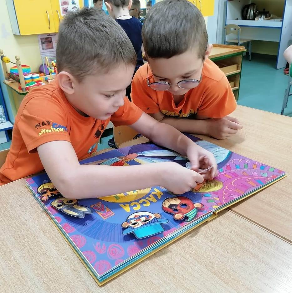 Тифлокомментарий: цветная фотография. Светлое помещение группы детского сада. Два мальчика лет шести в оранжевых футболках сидят за столом и увлеченно рассматривают лежащую перед ними большую книгу. На рисунке — касса цирка, зритель покупает билет, по периметру расположены тактильные иллюстрации цирковых персонажей: медведя, тигра, дрессировщика.