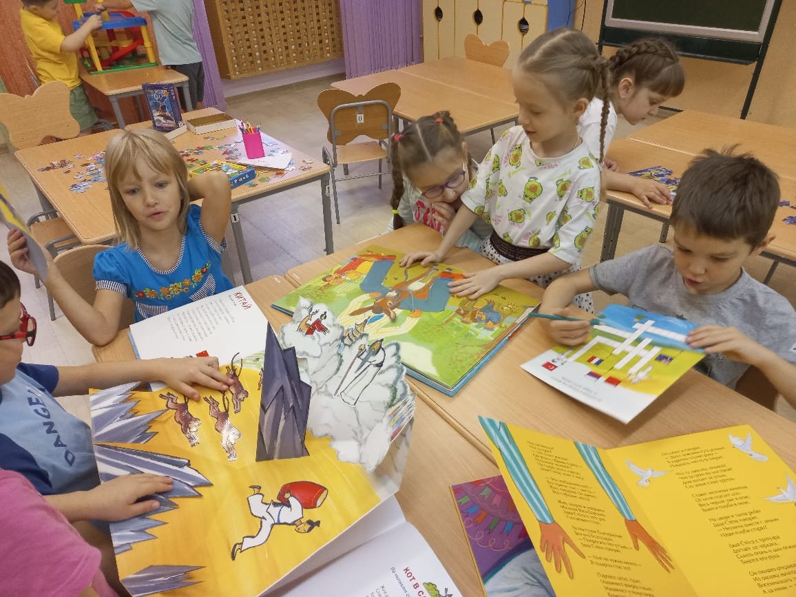 Тифлокомментарий: цветная фотография. За светлыми квадратными столами играют дети. За столом на переднем плане пять детей, двое мальчиков и три девочки, с интересом изучают красочные книги с большими объемными картинками, показывают друг другу яркие панорамные иллюстрации.