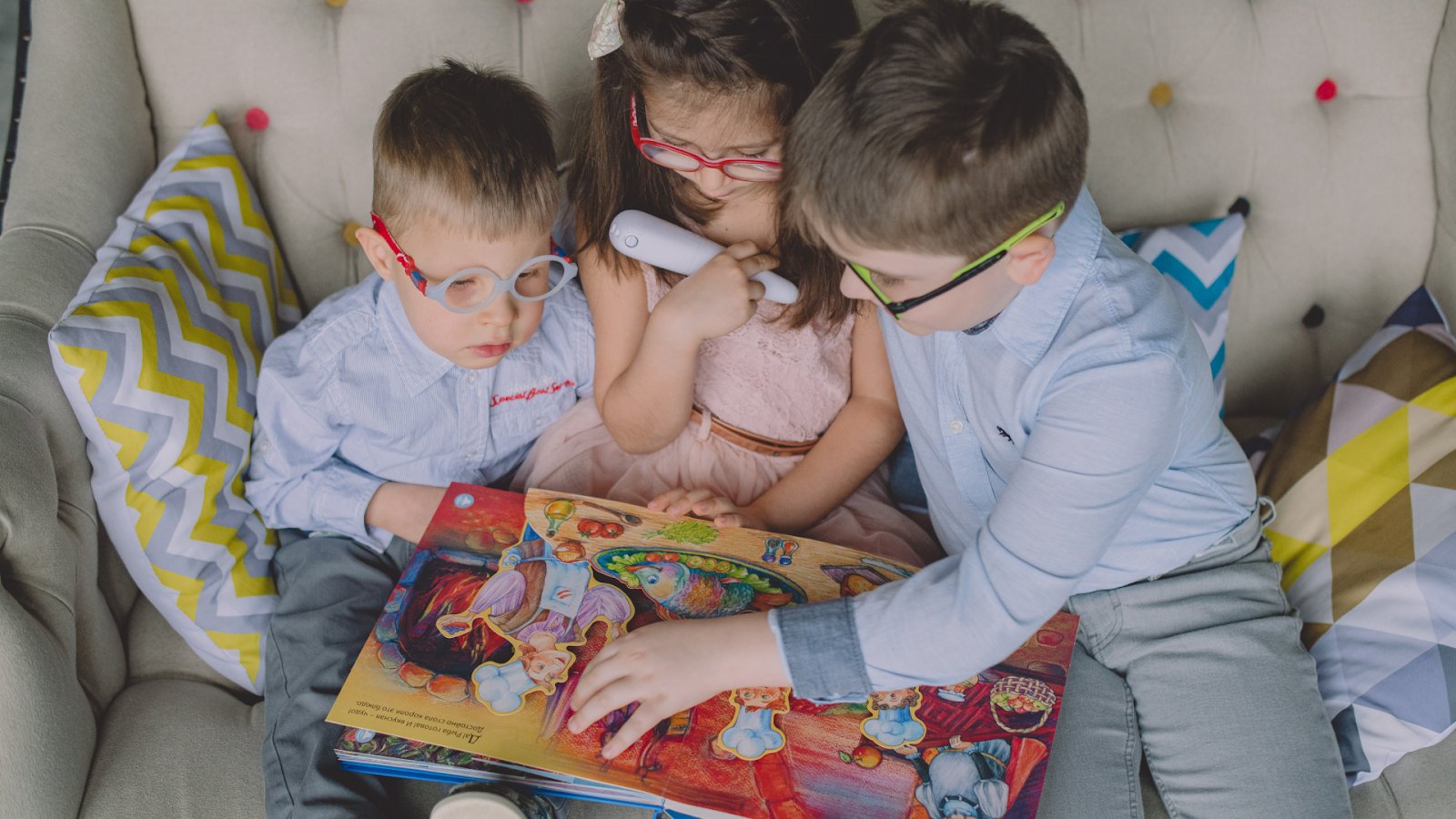 Тифлокомментарий: цветная фотография. Три ребенка в очках с цветными оправами сидят на светлом диване, склонившись над большой яркой книгой. Ее держит на коленях девочка лет шести в розовом платье, она сидит в центре. В правой руке она сжимает «Волшебный карандаш». Это интерактивное устройство белого цвета, в форме морковки, которое помогает читать книгу, озвучивает картинки. По обе стороны от девочки сидят мальчики в светлых рубашках и брючках. Одному из них не больше двух лет, другой, постарше, тянется рукой к цветным тактильным иллюстрациям книги.