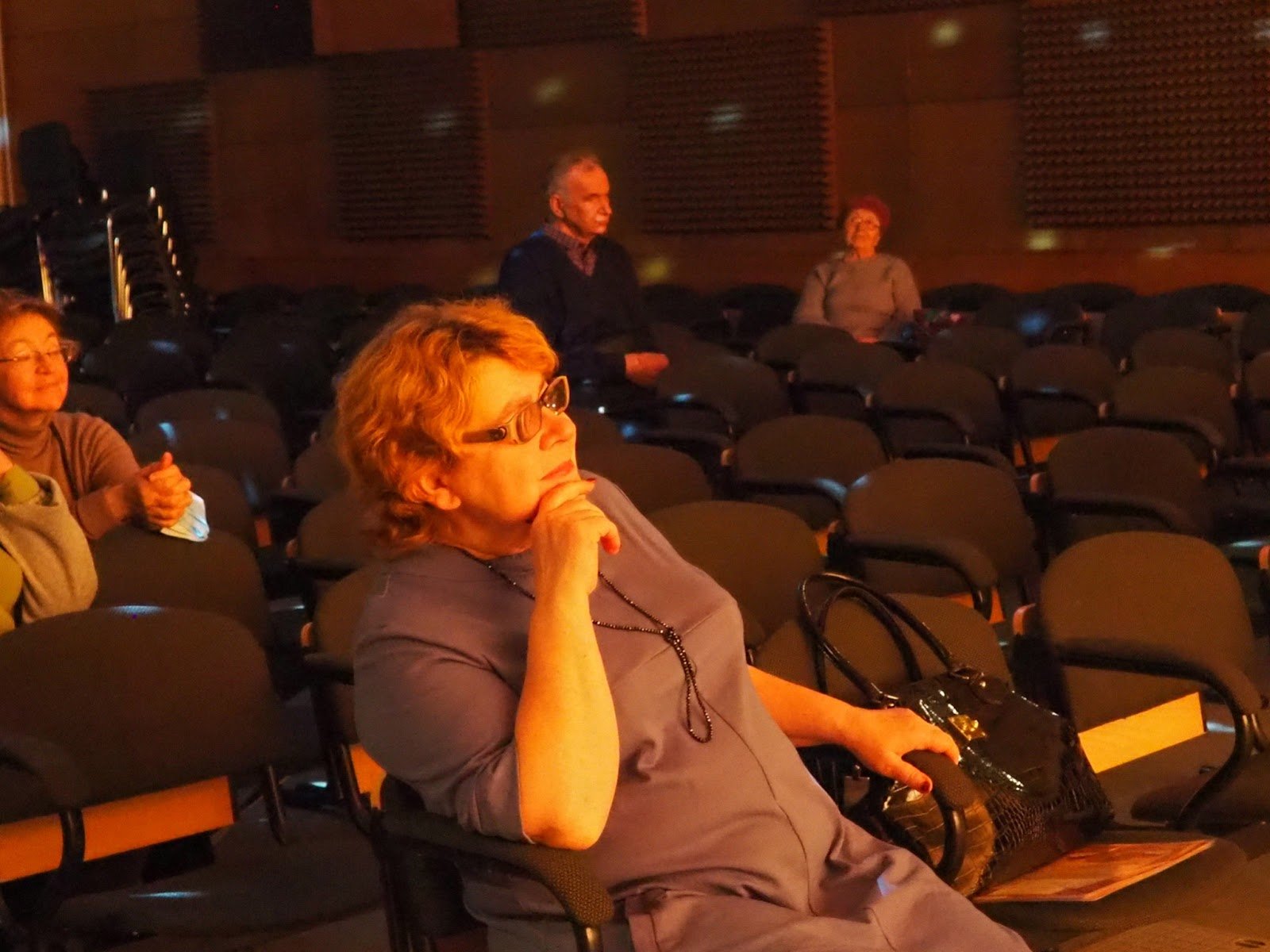 Тифлокомментарий: цветная фотография. Полупустой зрительный зал в приглушенном свете. По стенам рассыпаны цветные блики. В темных креслах сидят несколько человек среднего и старшего возраста в повседневной одежде. Они с интересом следят за репетицией. На переднем плане женщина с короткой стрижкой, в очках с толстыми линзами. На ней сиреневое трикотажное платье, длинные бусы в тон. Женщина касается рукой подбородка, улыбаясь, смотрит на сцену.