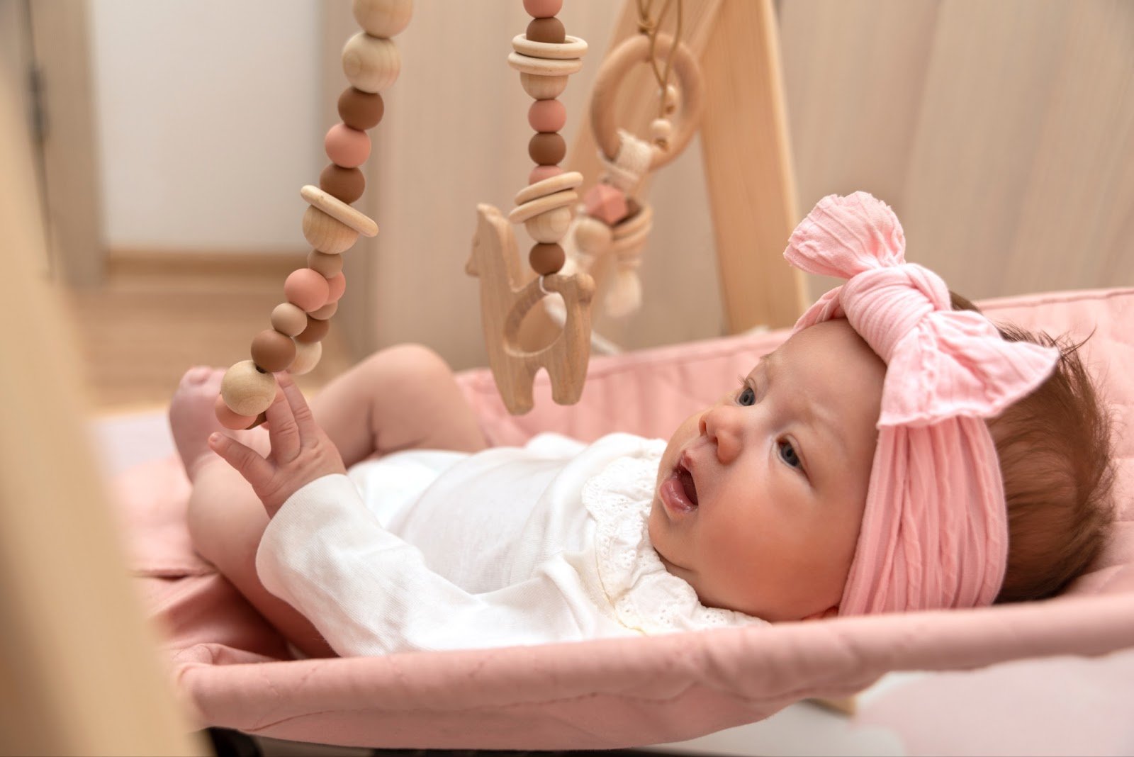 Тифлокомментарий: цветная фотография. Светлая комната. В розовой люльке лежит голубоглазая девочка. Ей около месяца. На малышке белая кофточка с кружевным воротничком, на голове широкая розовая повязка с бантом. Девочка подогнула ножки, она с интересом разглядывает подвесную деревянную игрушку, чуть касается ее пальчиками. Это деревянные бусы из крупных розовых и бежевых шариков, колец и лошадок.