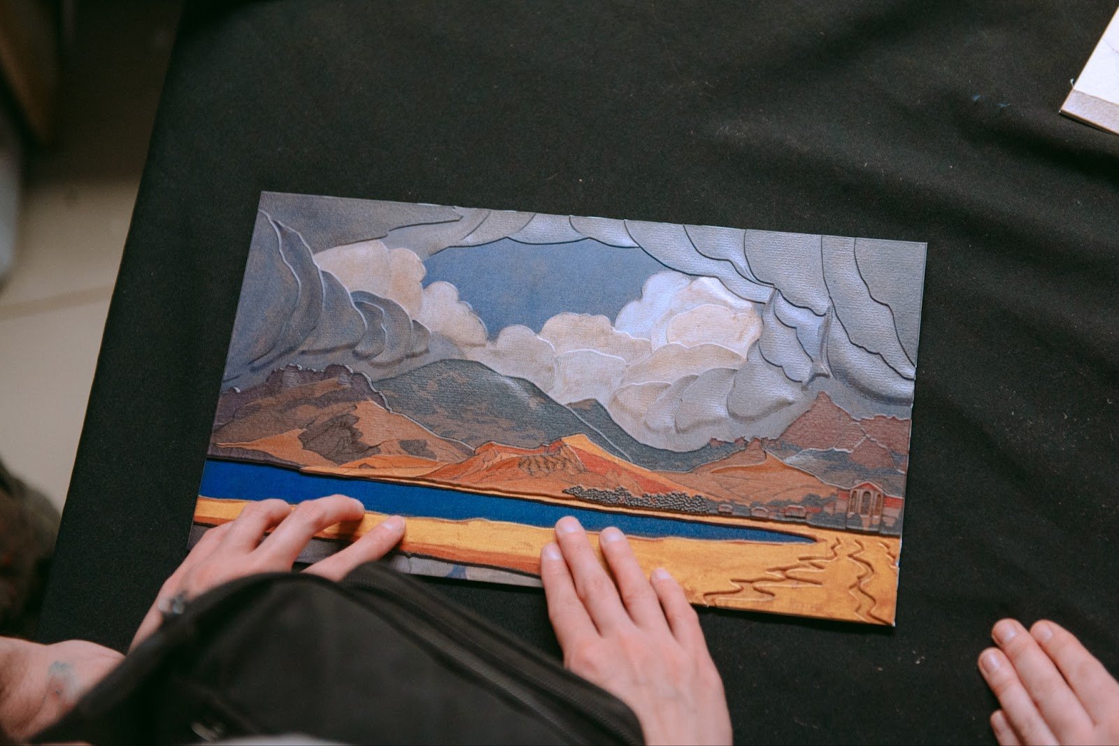 Тифлокомментарий: цветная фотография. Крупный план тактильной рельефной модели, подготовленной мастерами на основании картины. Мы видим, как несколько человек знакомятся с изображением через прикосновение к тактильной модели пальцами рук. На картине изображены песчаные горы.