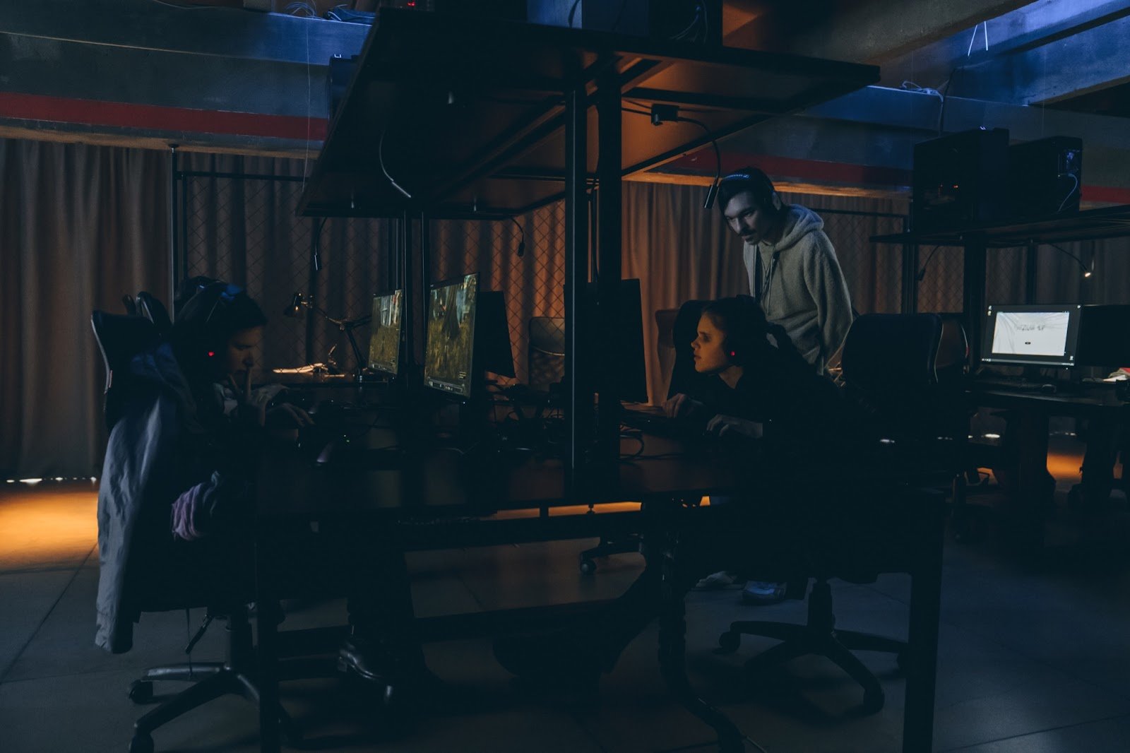 Тифлокомментарий: цветная фотография. Компьютерный клуб в полумраке. За центральным игровым столом лицом друг к другу сидят две девушки в массивных черных наушниках. Они увлечены игрой, с интересом смотрят на мониторы своих компьютеров. Из-за спины одной из них за ходом игры наблюдает молодой человек в светлой толстовке.