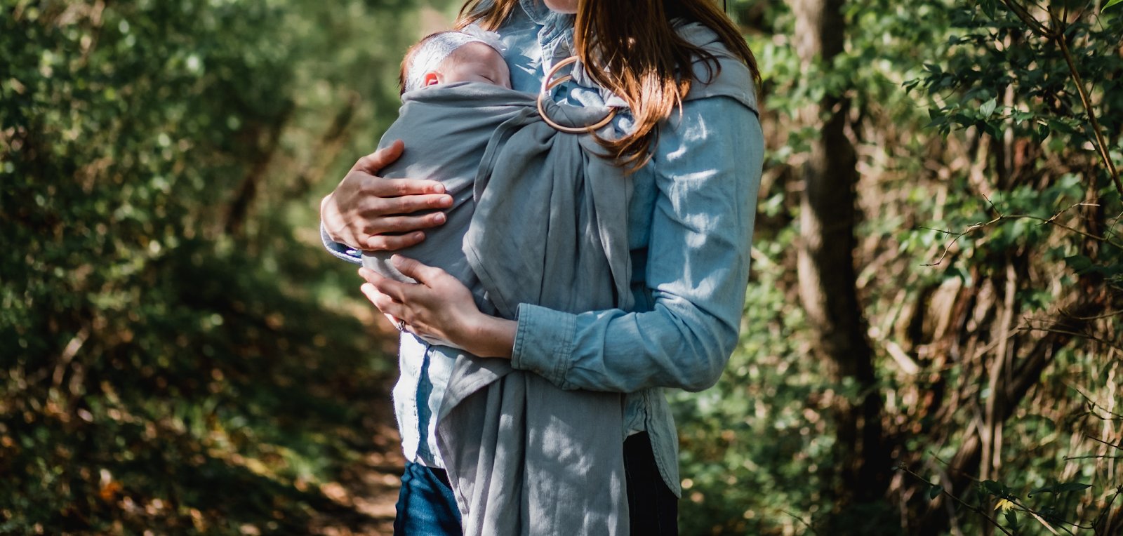 Тифлокомментарий: цветная фотография. Мама с младенцем прогуливается по лесной тропинке. Она одета в джинсовую рубашку и синие джинсы. Спящий ребенок укутан в слинг. Мама заботливо его придерживает.