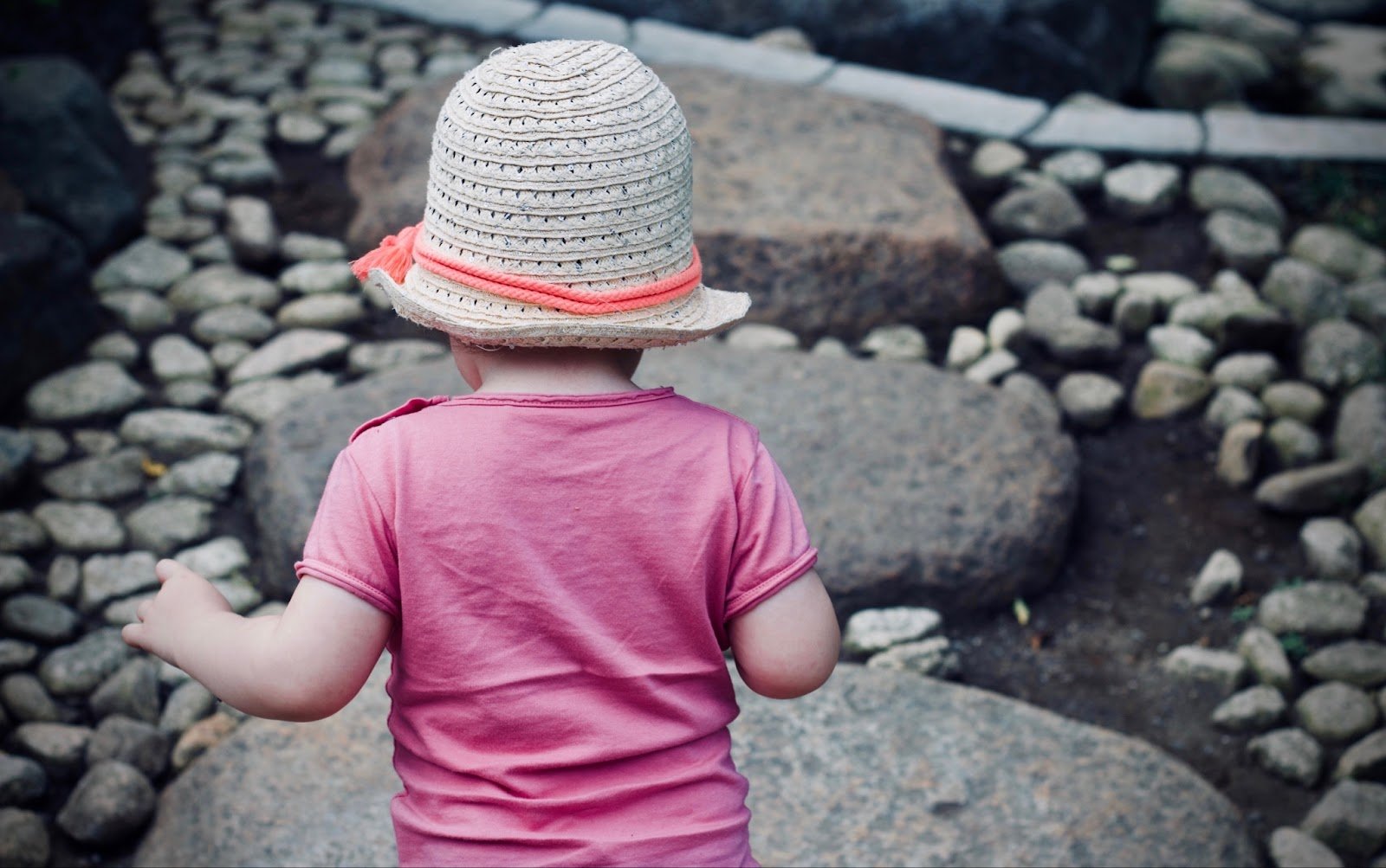 Тифлокомментарий: цветная фотография. Двухлетняя девочка прогуливается по каменной дорожке. На ней розовая футболка и панама со шнурком оранжевого цвета. Ребенок аккуратно передвигается по дорожке, выложенной большими камнями.