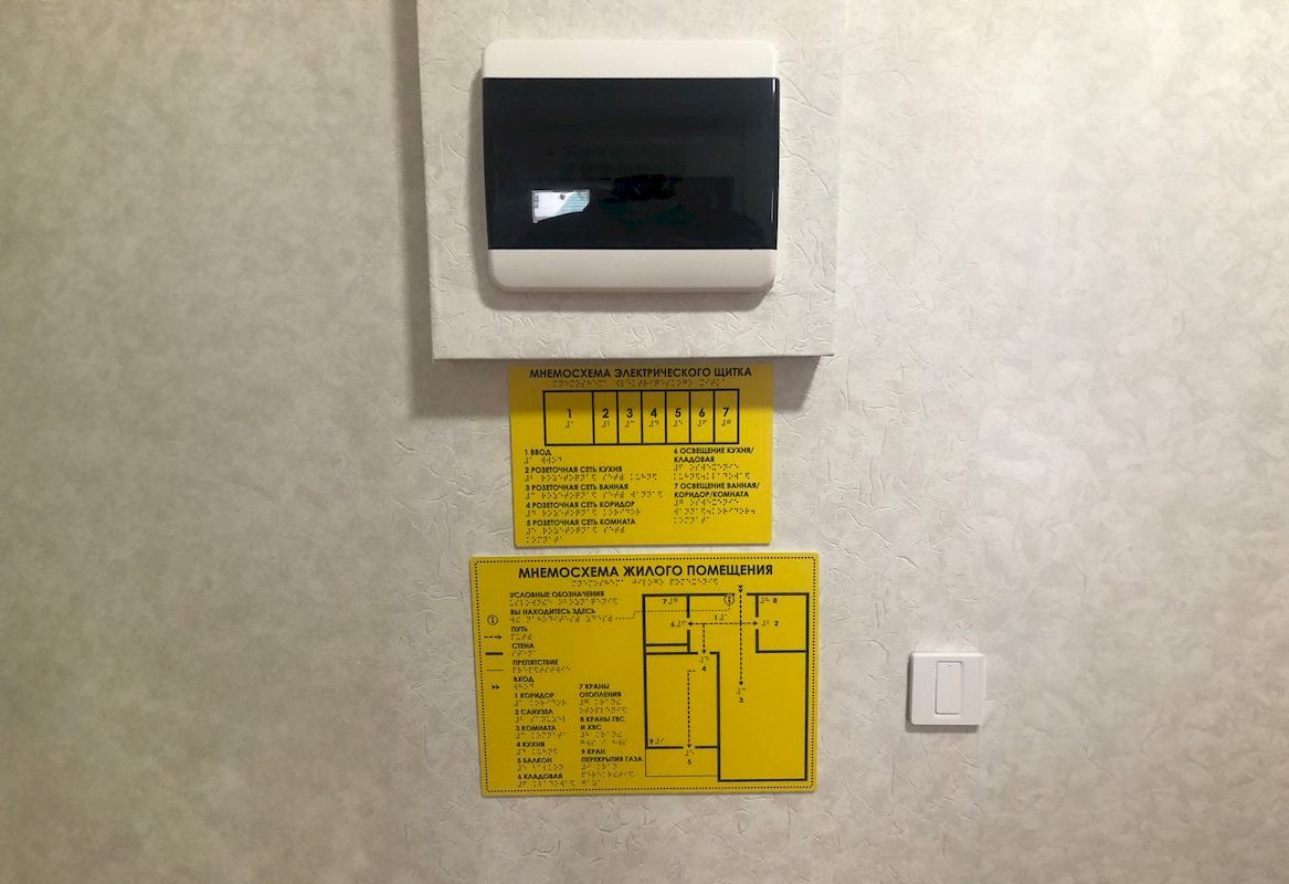 Тифлокомментарий: цветная фотография. На светлой стене расположен электрический щит. Он закрыт темной пластиковой панелью, под ним висят желтые тактильные мнемосхемы самого щитка и всей квартиры.