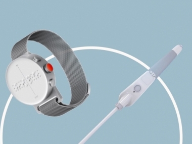 Тифлокомментарий: цветная фотография. На столе, на станции для зарядки, стоит белое прямоугольное устройство, похожее на пульт управления. На дисплее видны день недели, дата и время. Прибор снабжен внешним динамиком и двумя большими кнопками, с крестиком и галочкой.