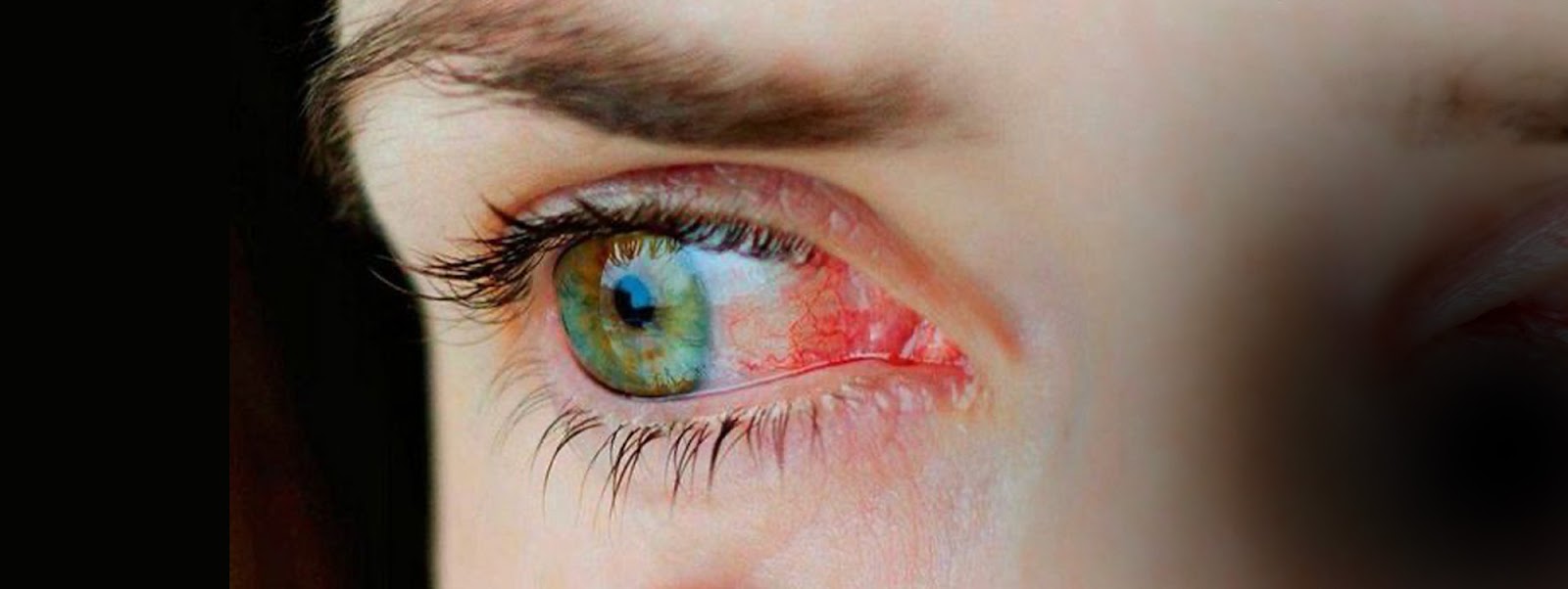 Тифлокомментарий: цветная фотография. Крупным планом глаз девушки с темными ресницами и серой радужкой. На всей белковой оболочке глаза покраснение.